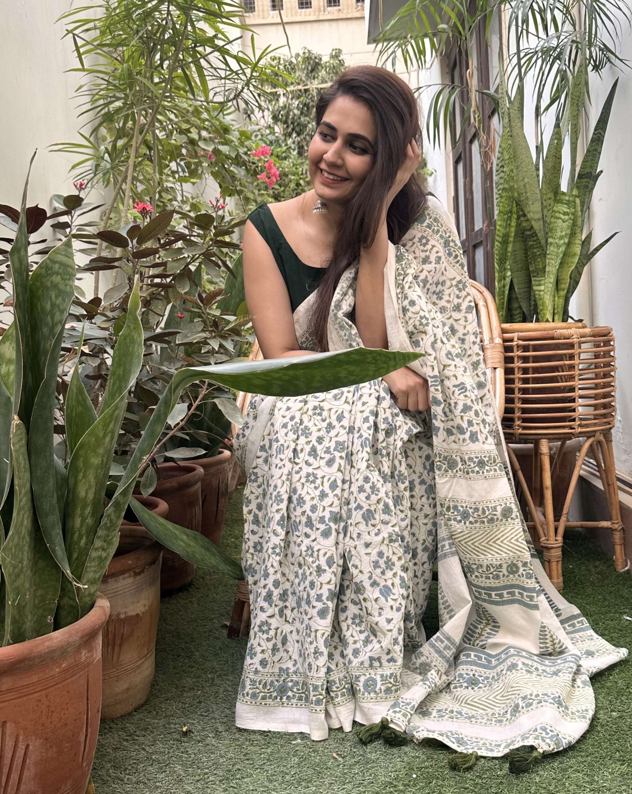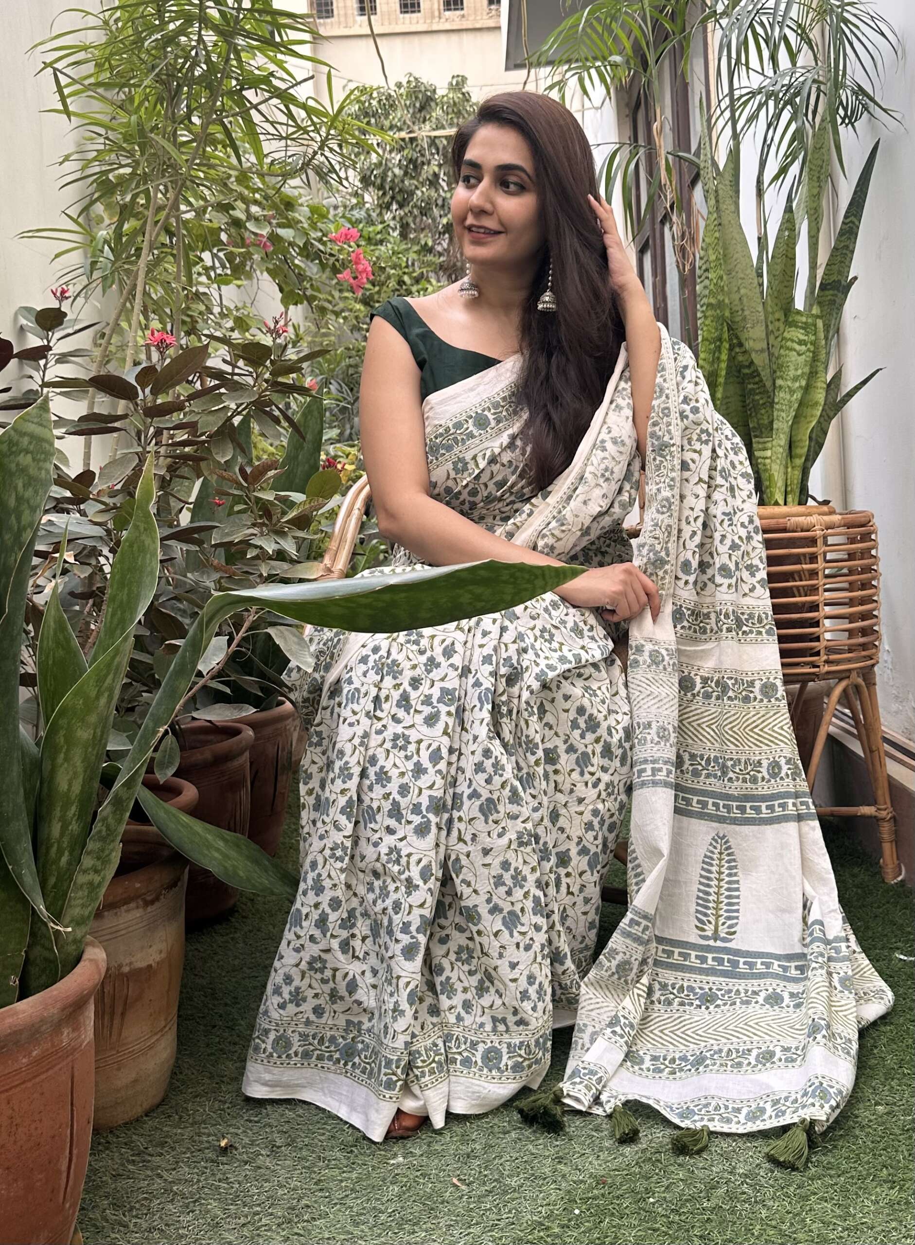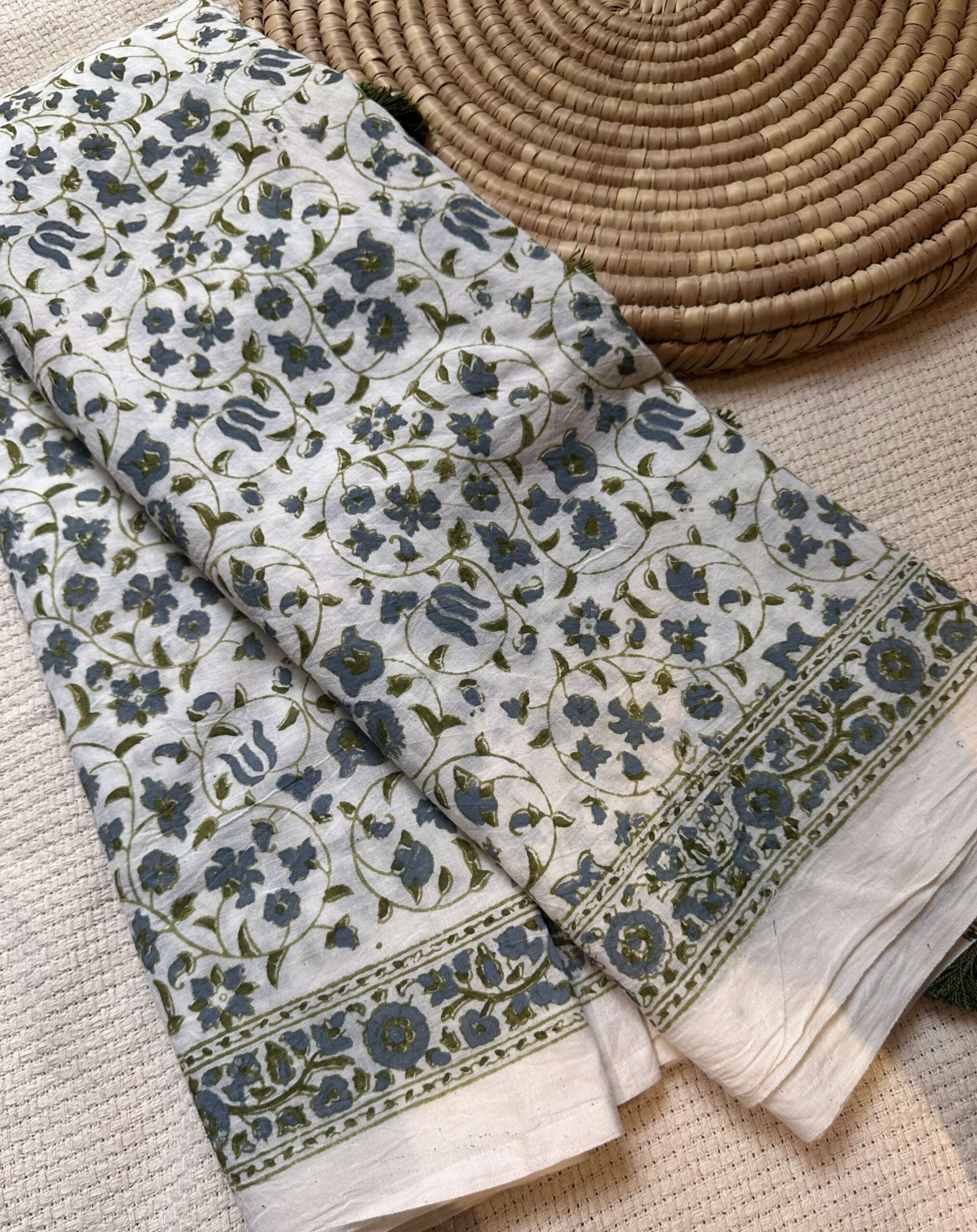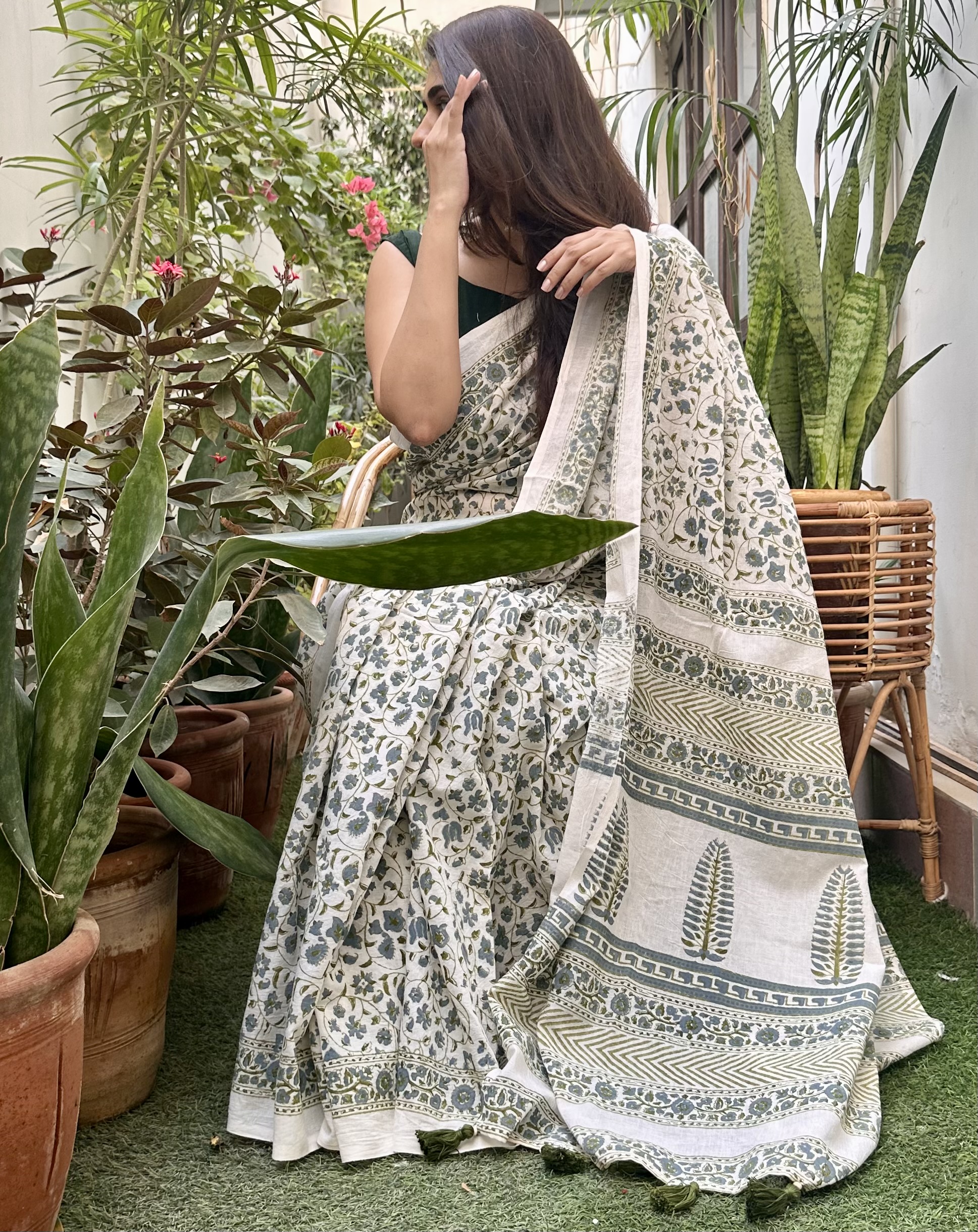 Material: pure cotton hand block printed saari with hand made tassel details along with khadi cotton olive green blouse