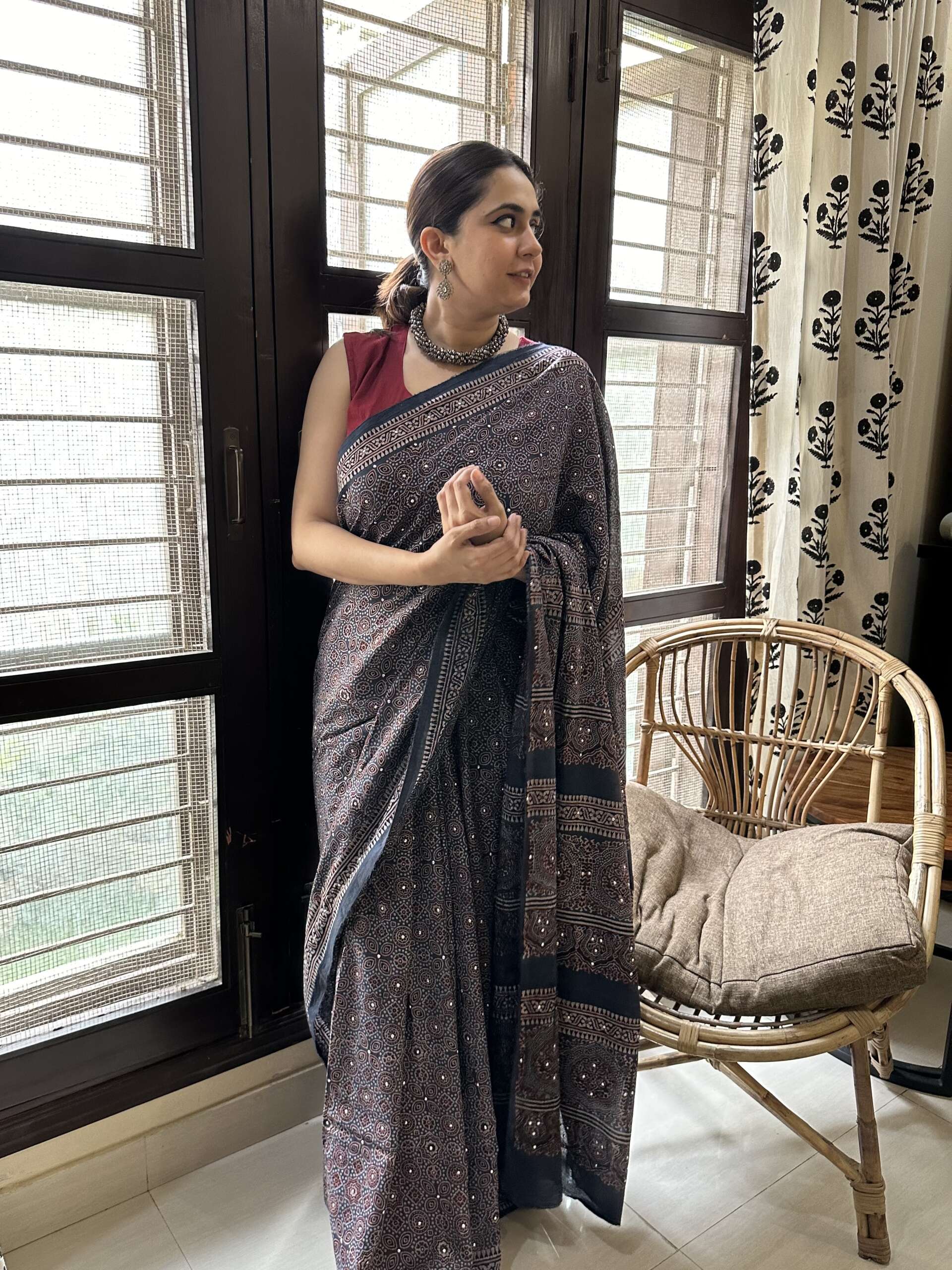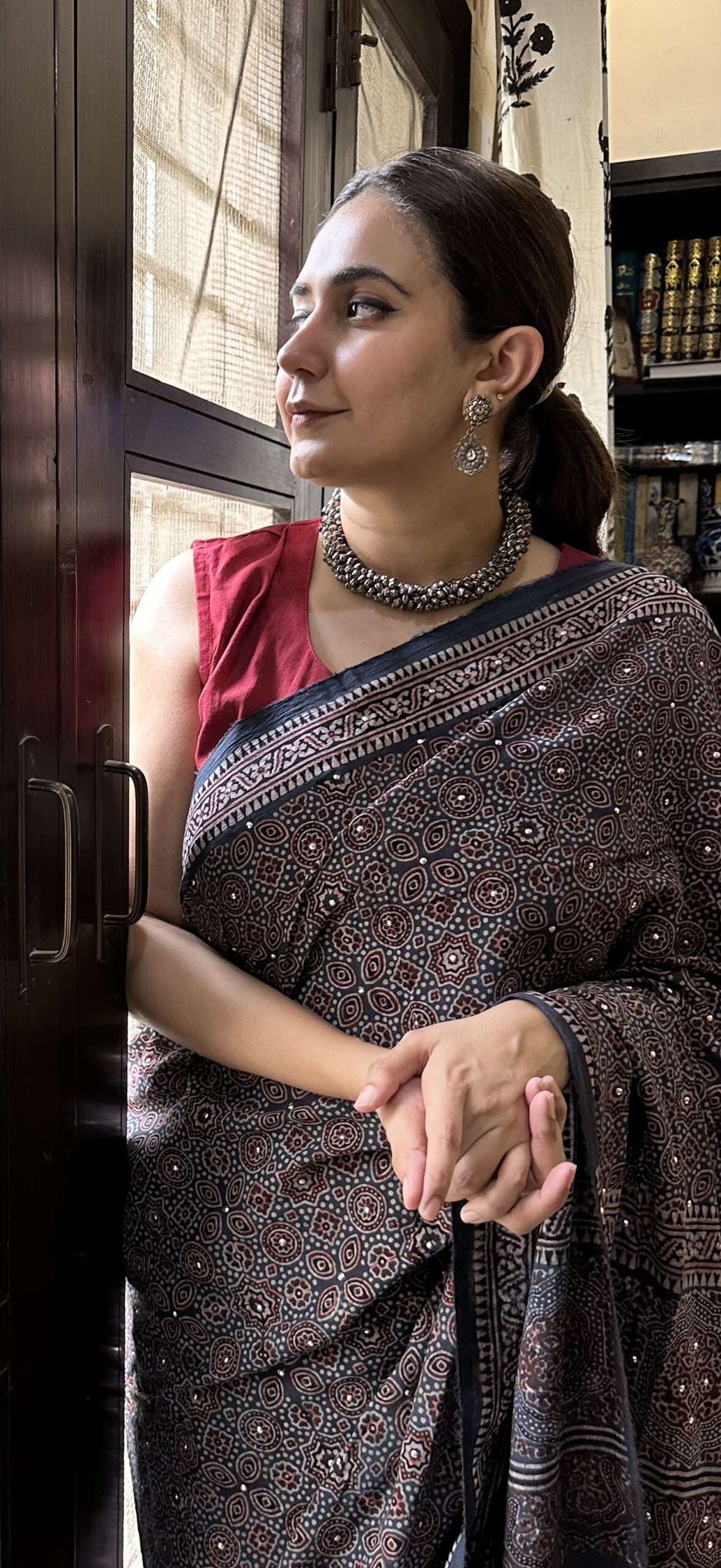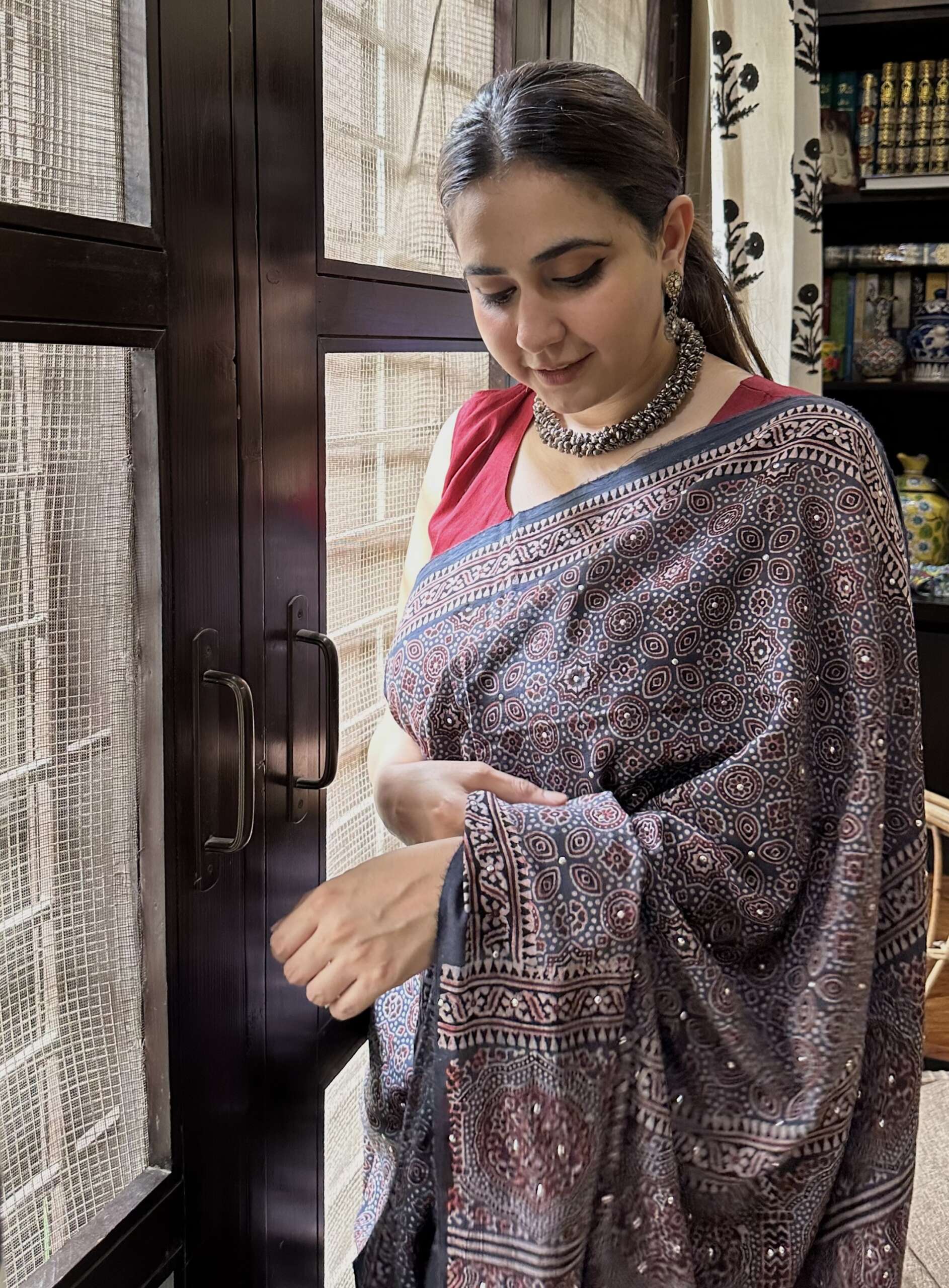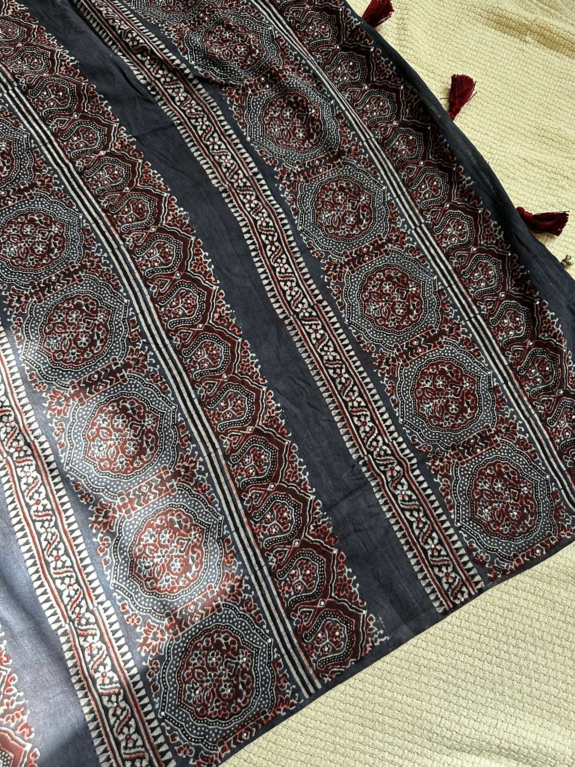 Material: pure cotton hand block printed in ajrak saari with hand made tassel details along with metal sequins
