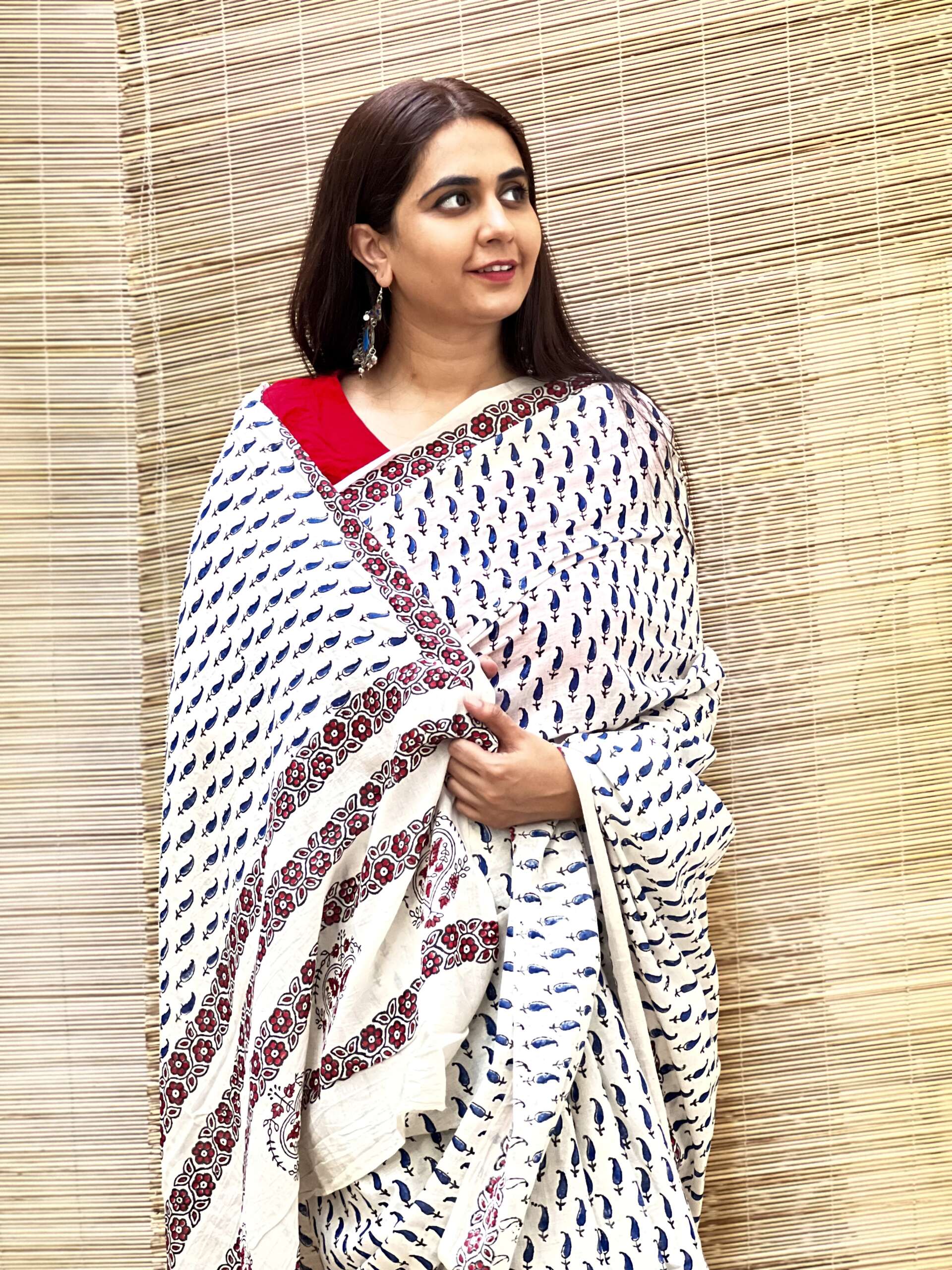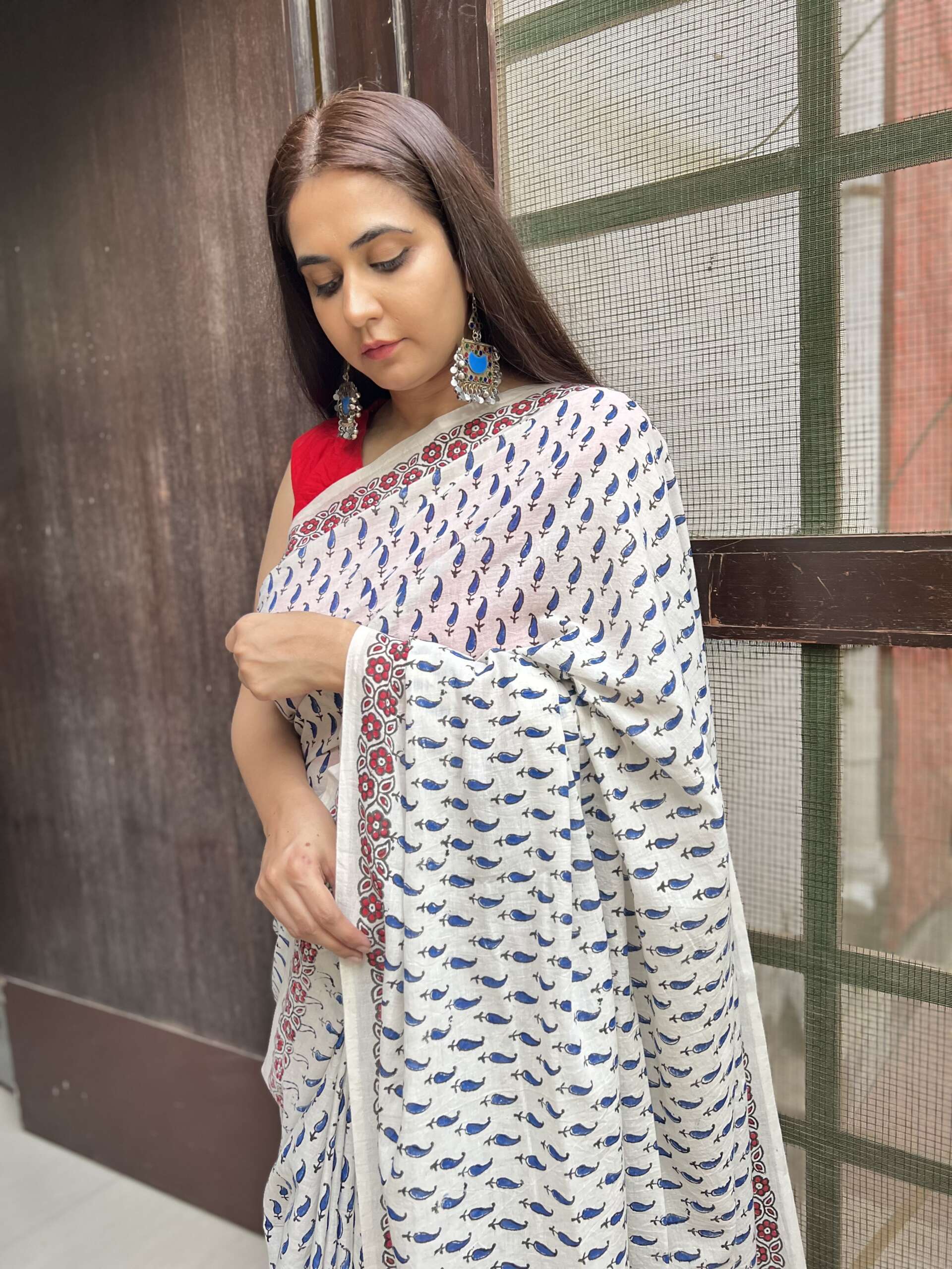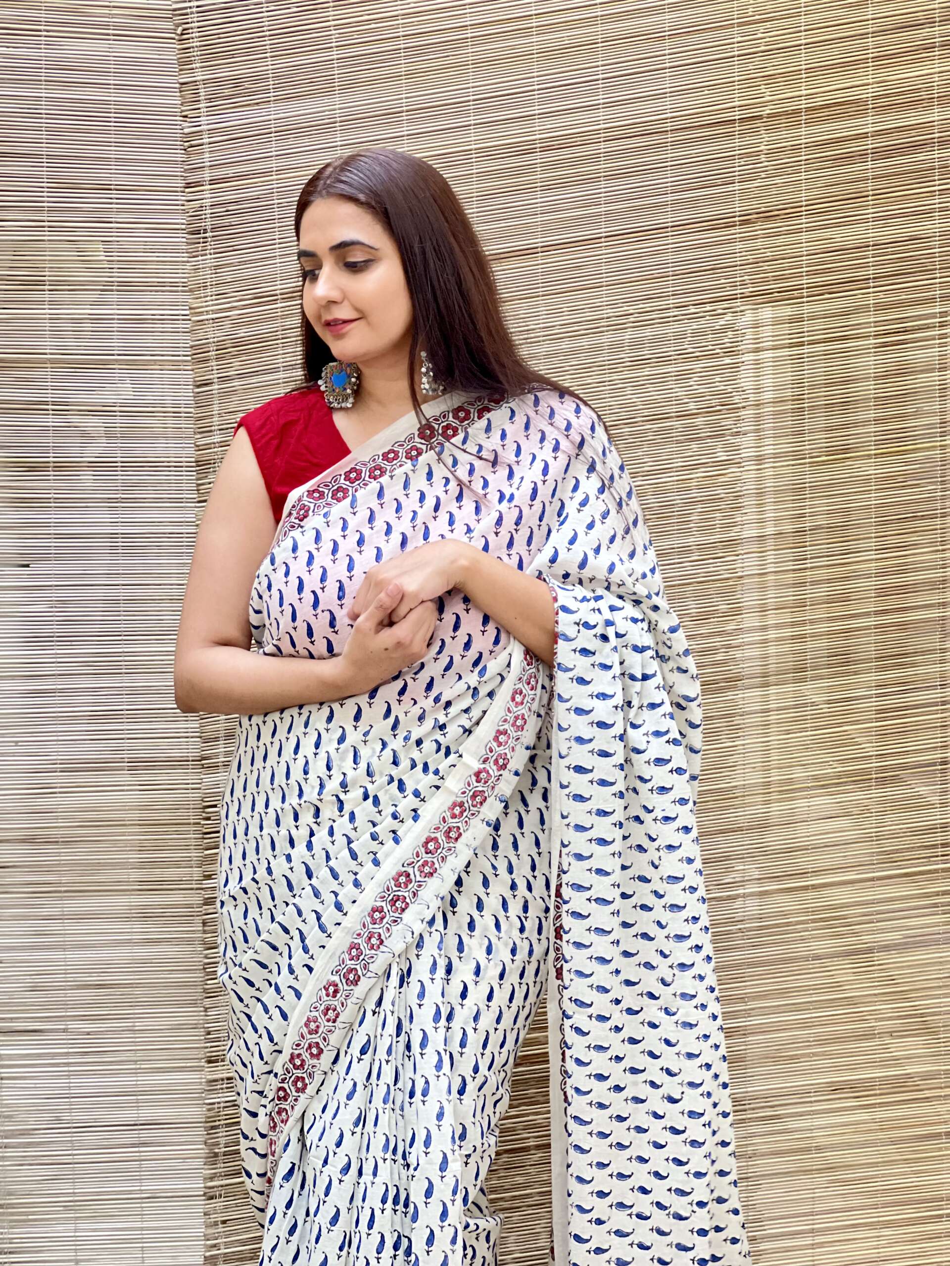 Material: pure cotton hand block printed saari with hand made tassel details along with blue khadi cotton blouse