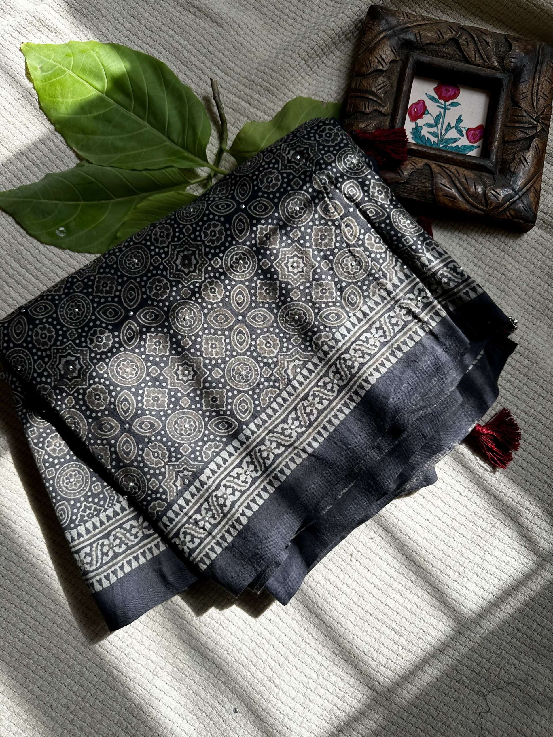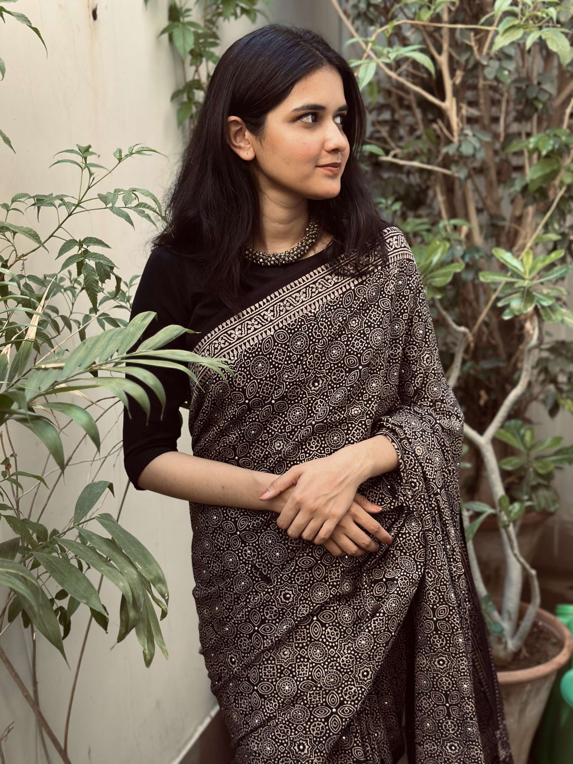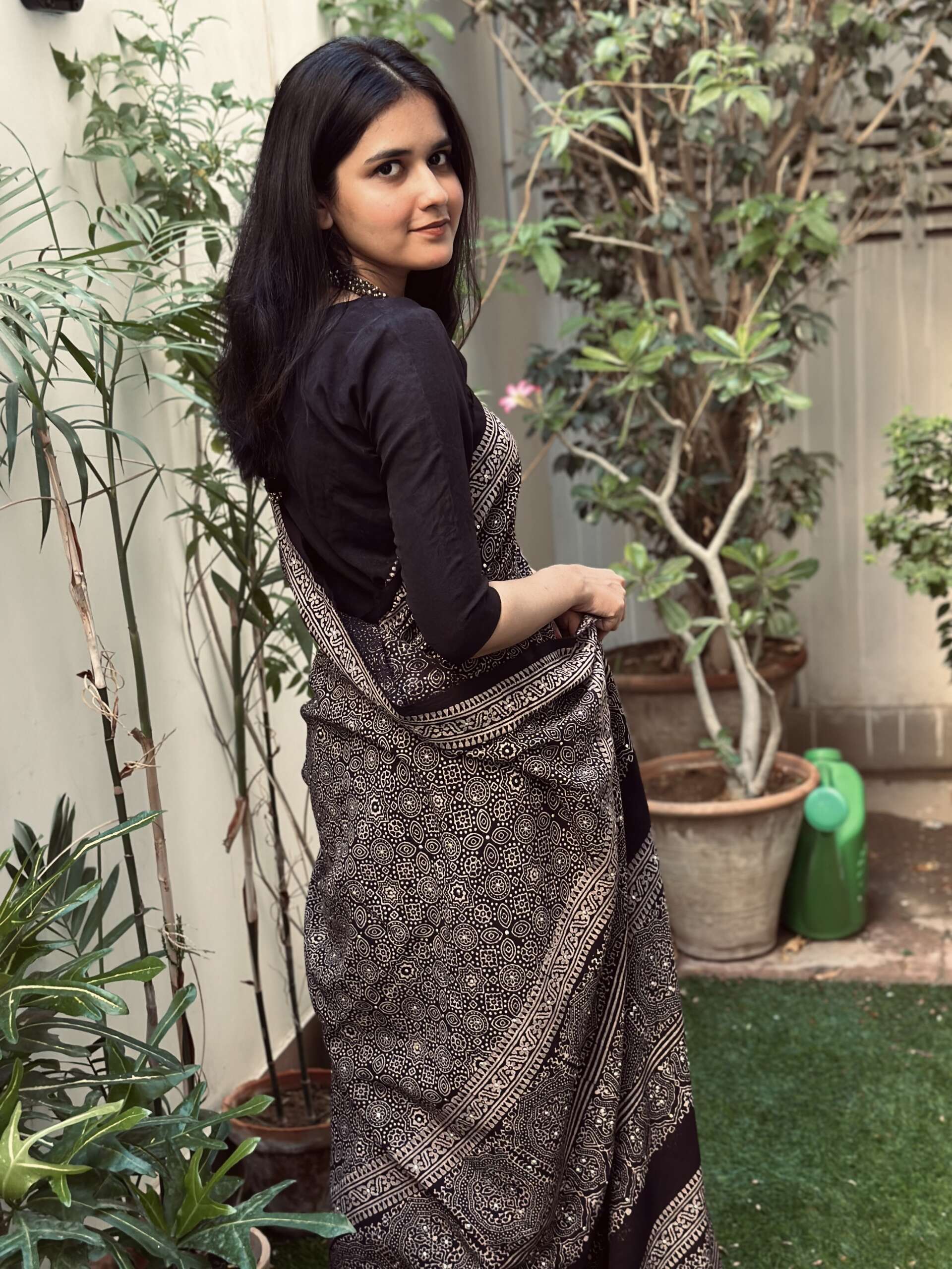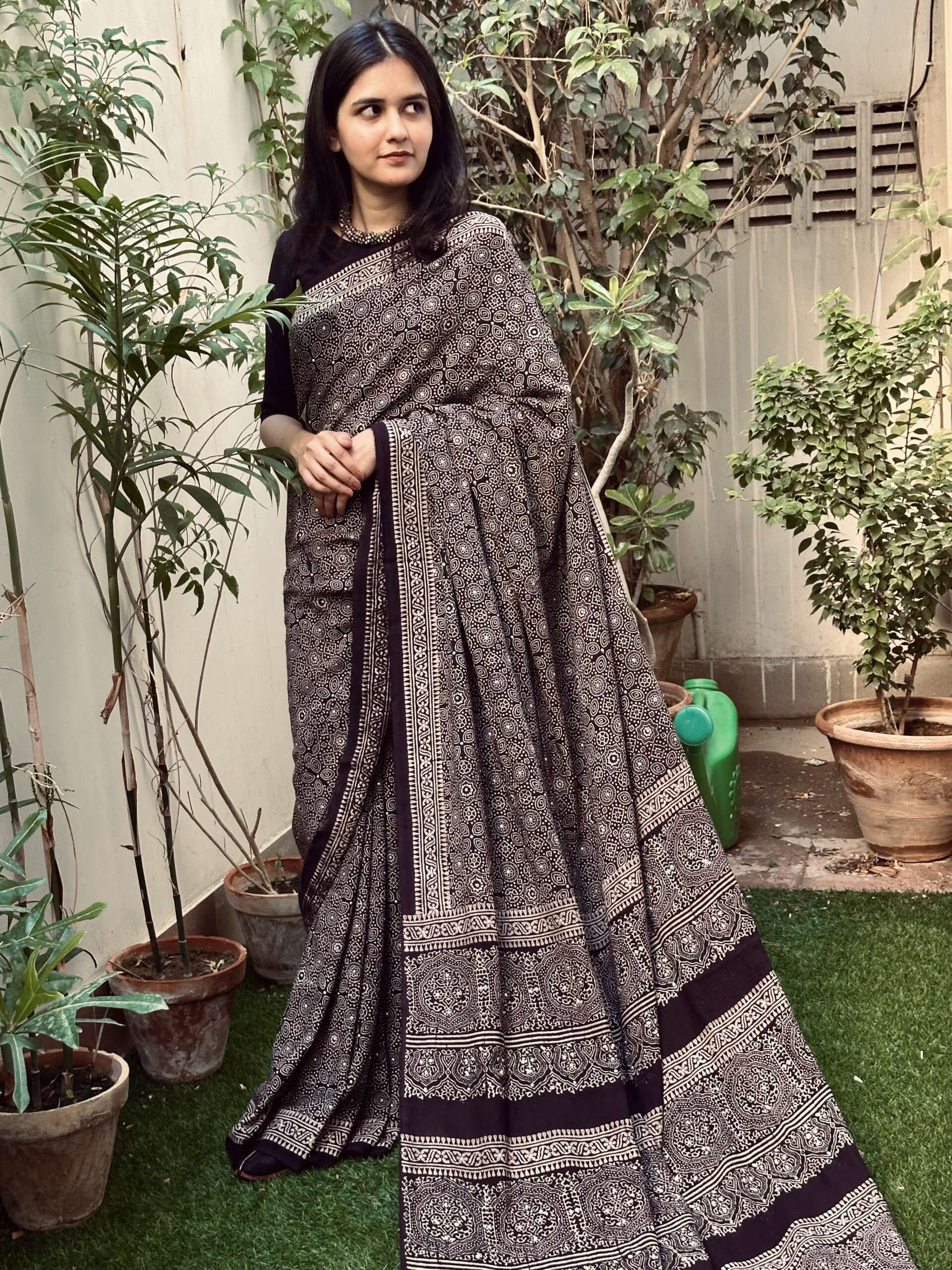 Material: pure cotton hand block printed saari in ajrak with metal sequins detailing with blouse in khadi cotton black