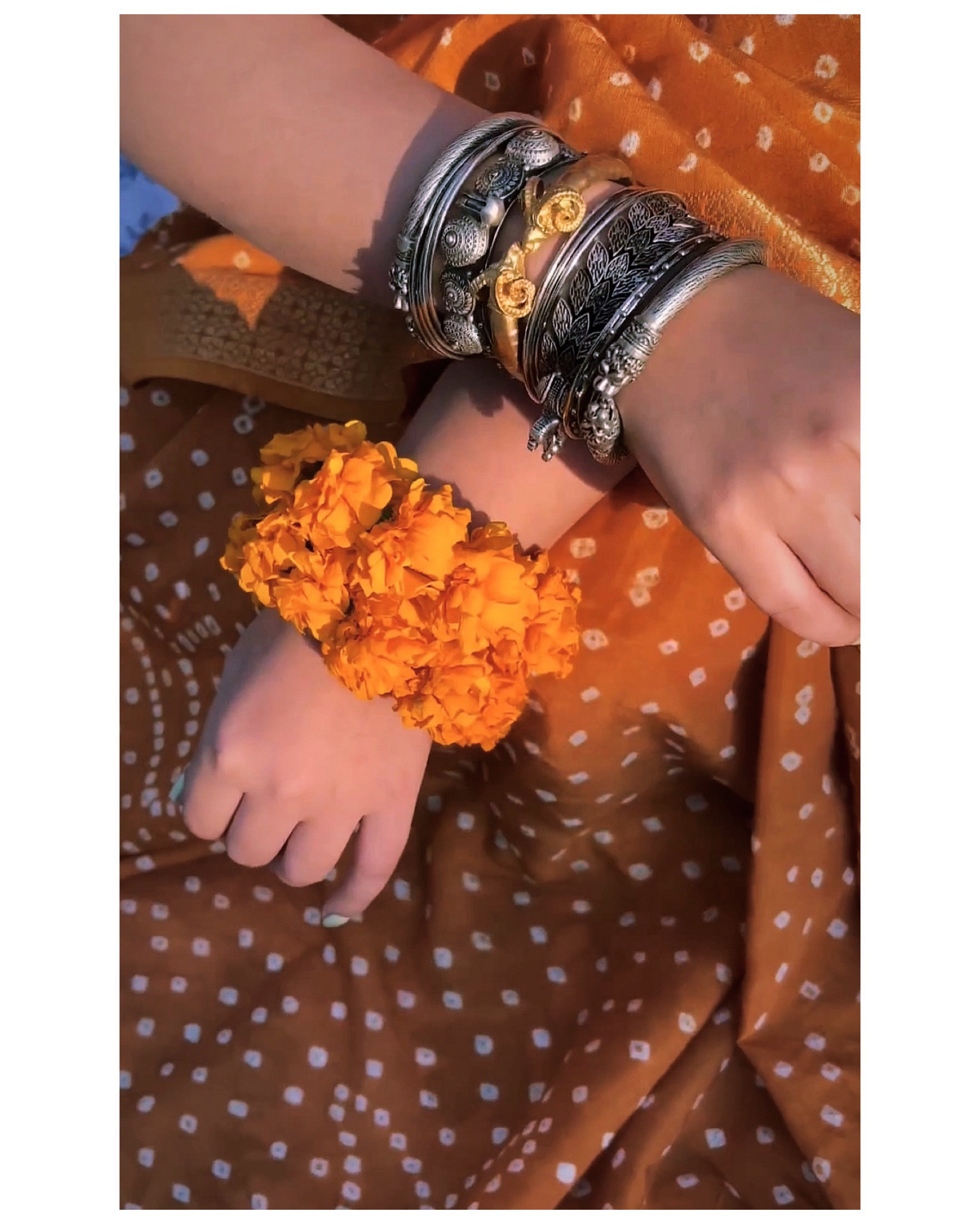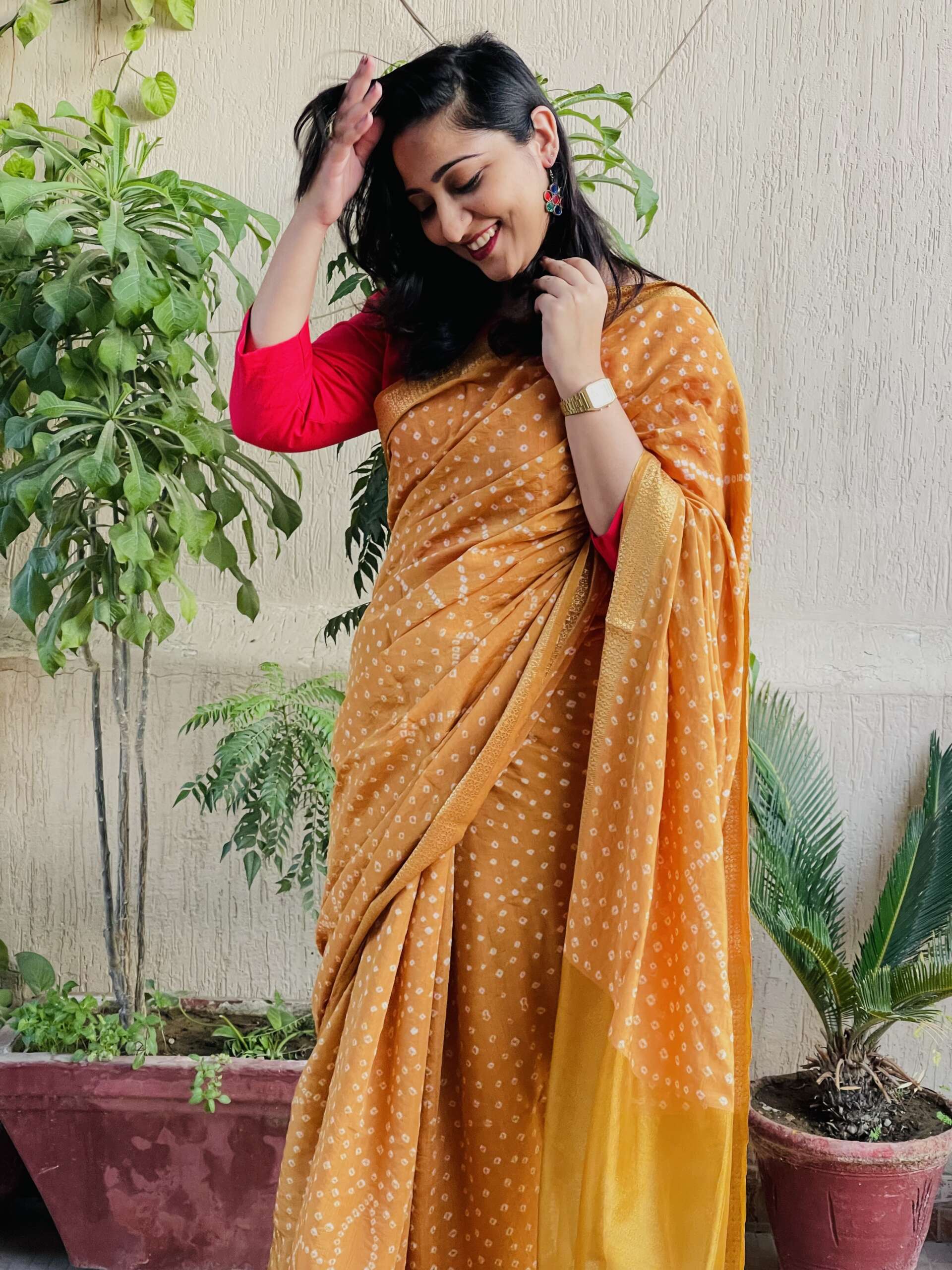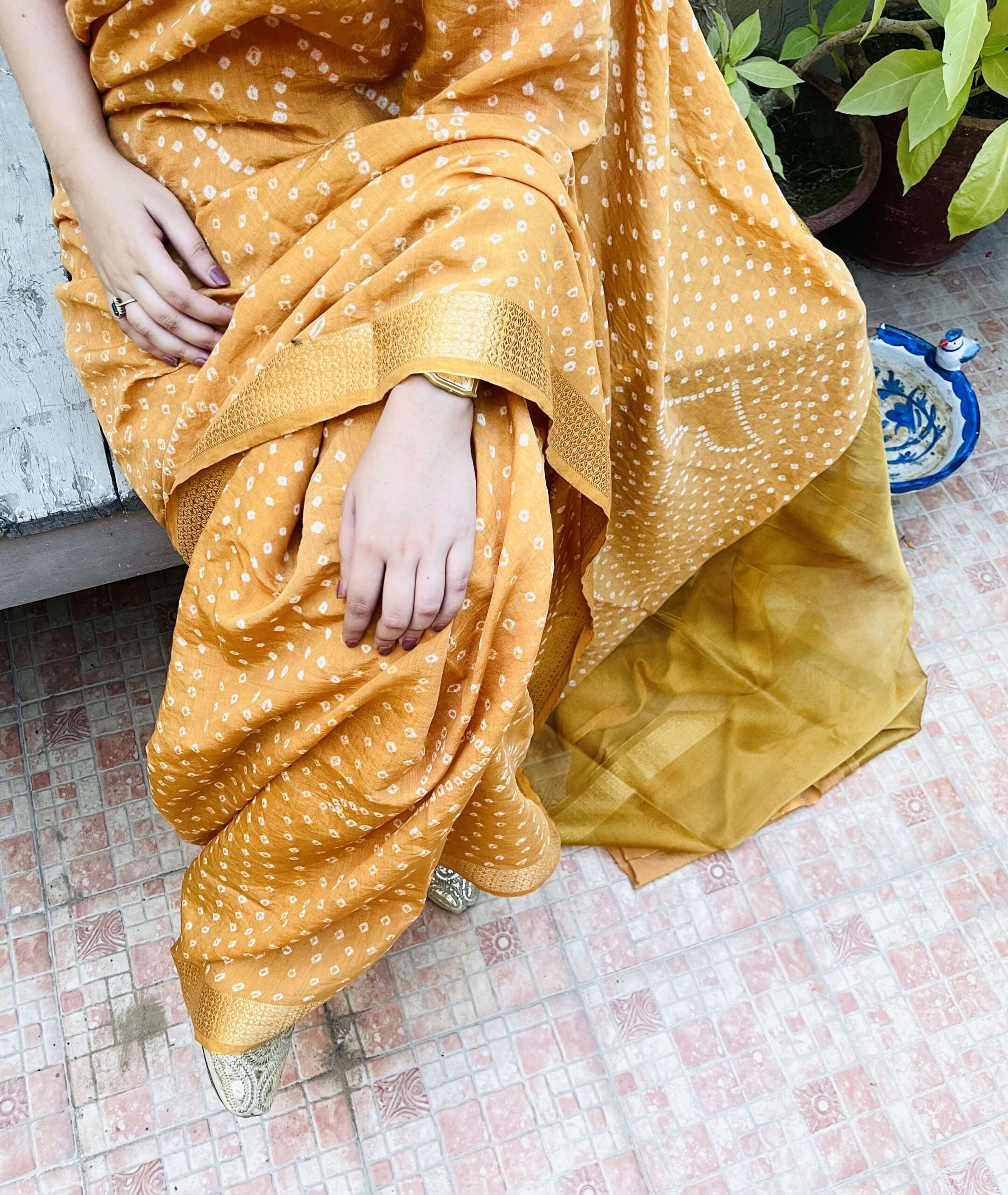 Material: cottonsilk hand made bandhni with banarsi borders and solid monochrome blouse