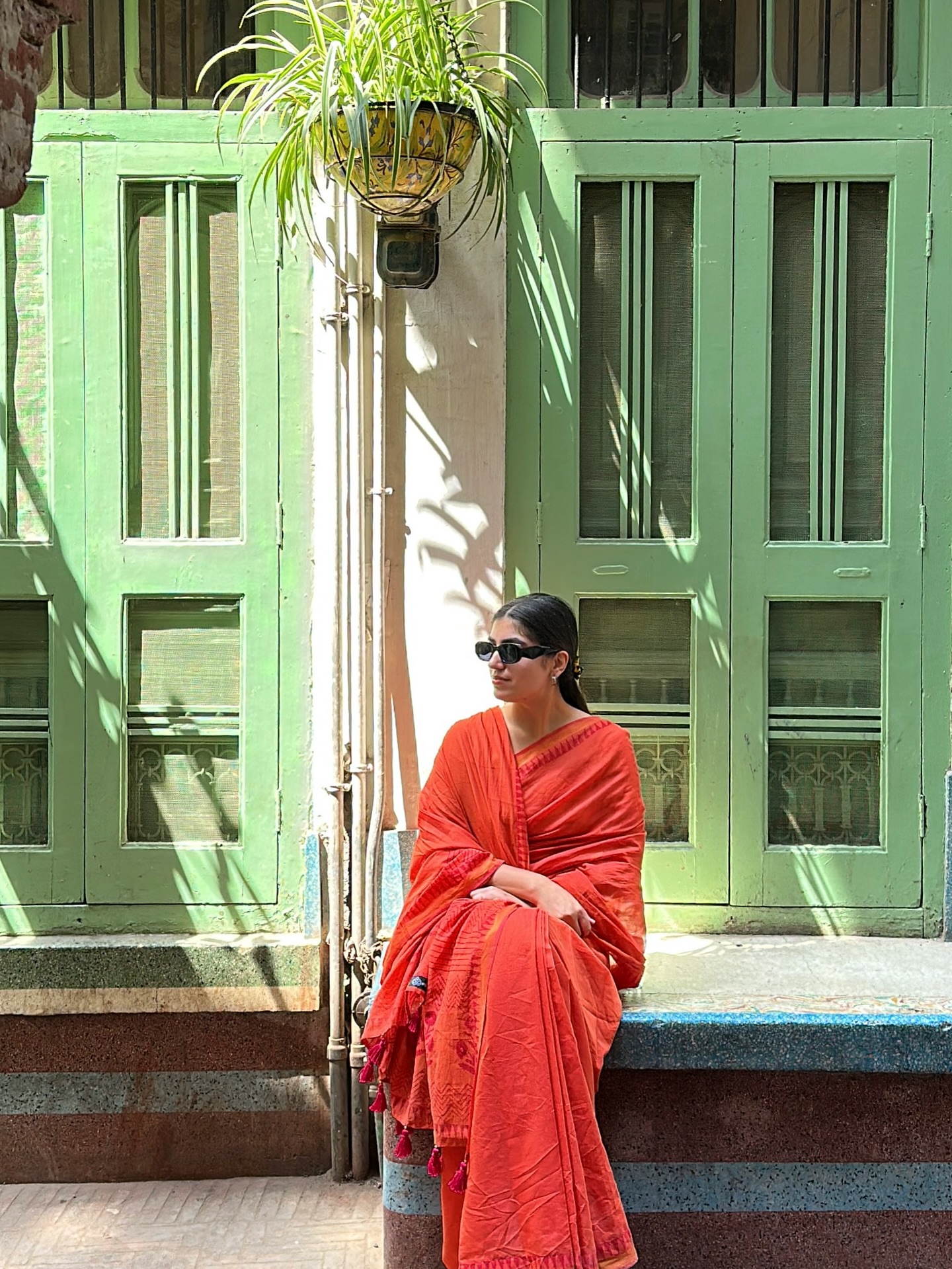 Material: cottonsilk hand loom saari with zari border and hand block print solid golden cottonsilk blouse