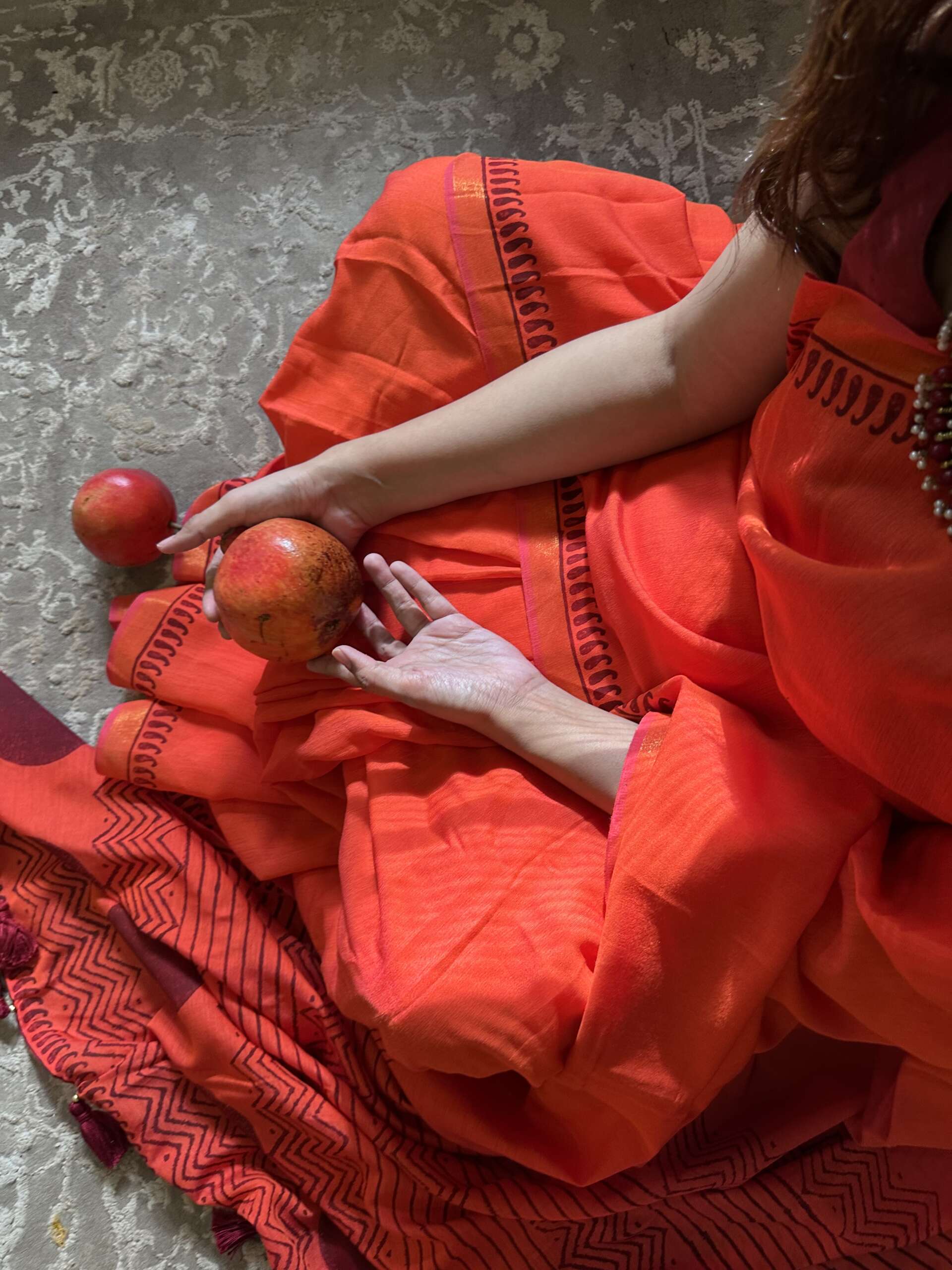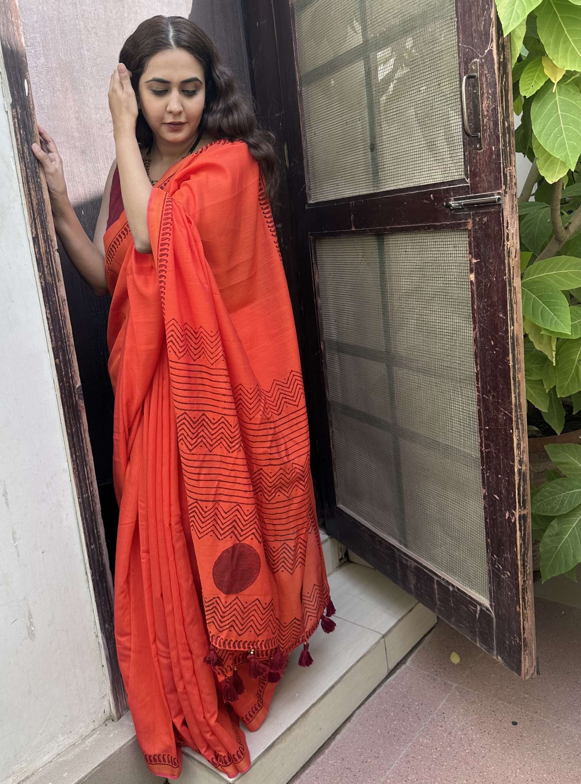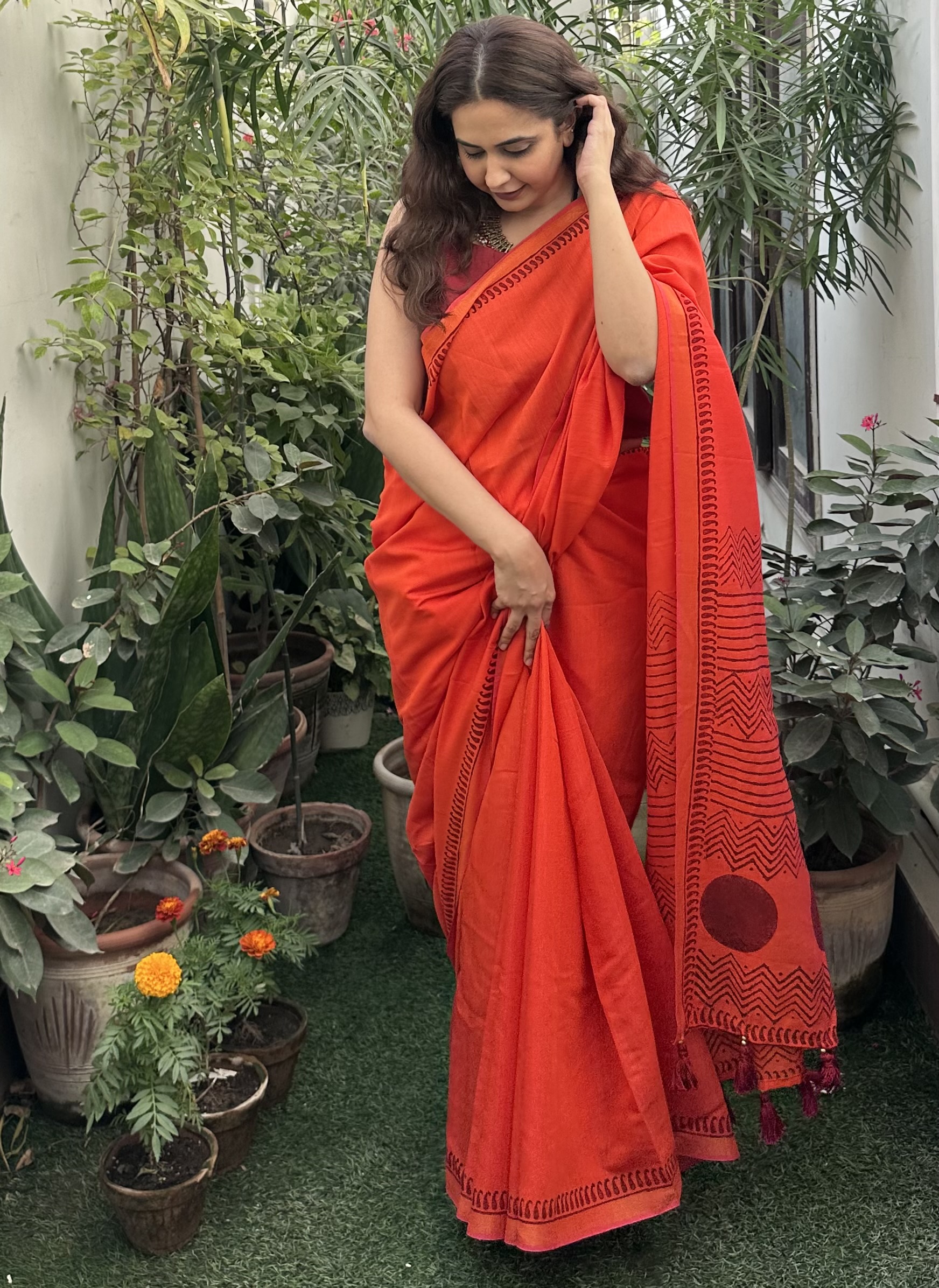 Material: Hand loom cottonsilk with hand block print and tassels detailing on pallu with orange blouse in cottonsilk