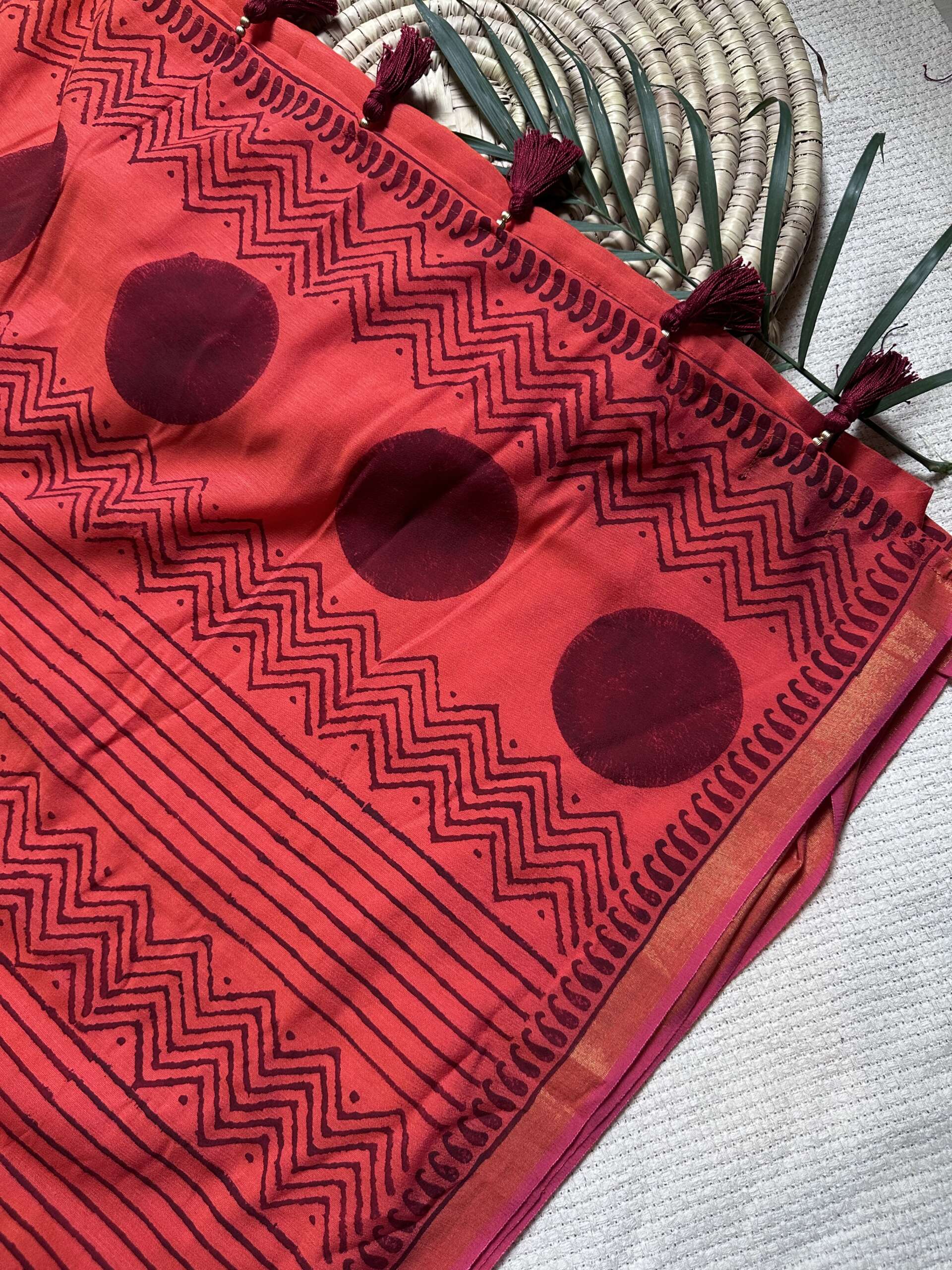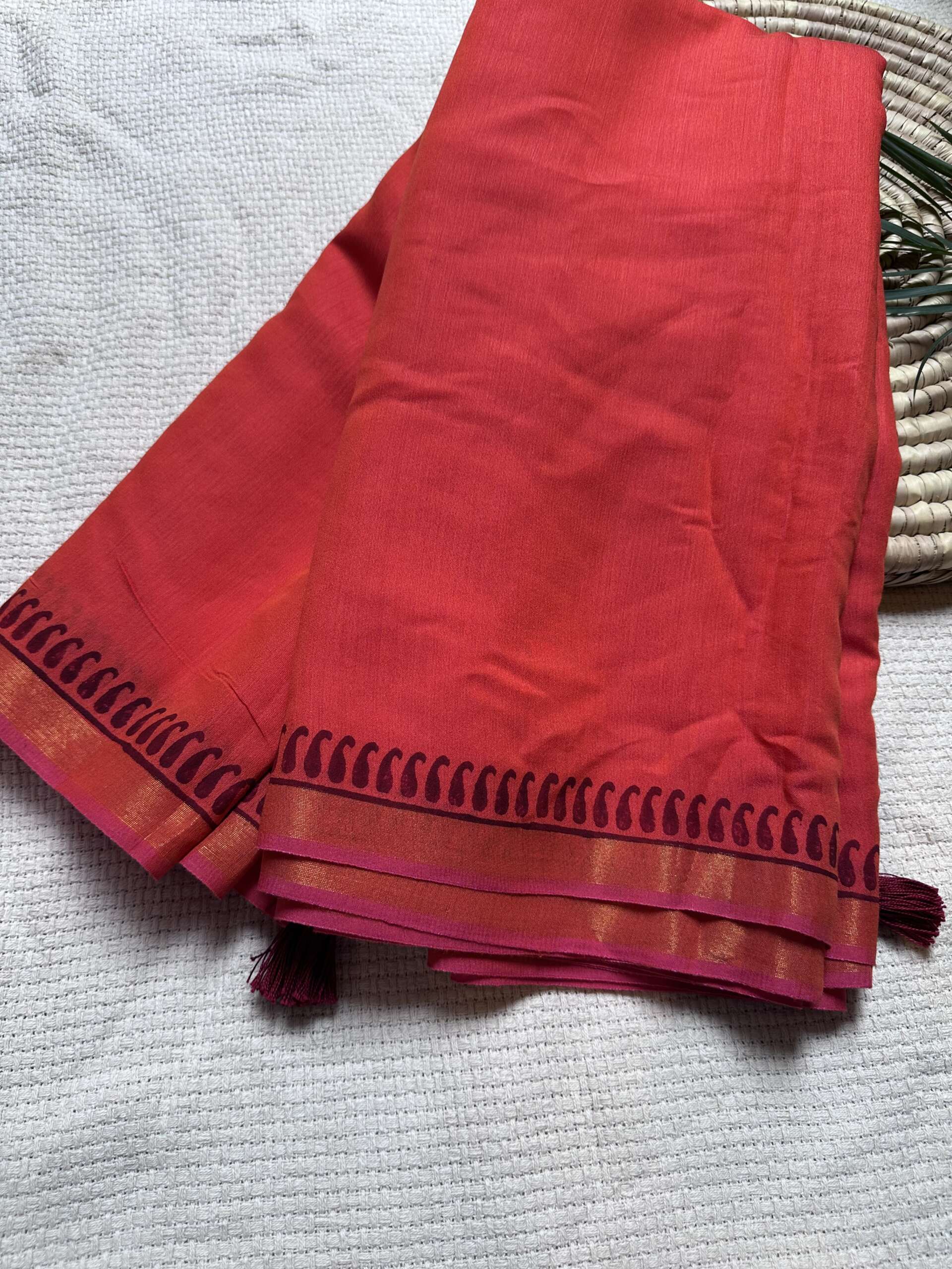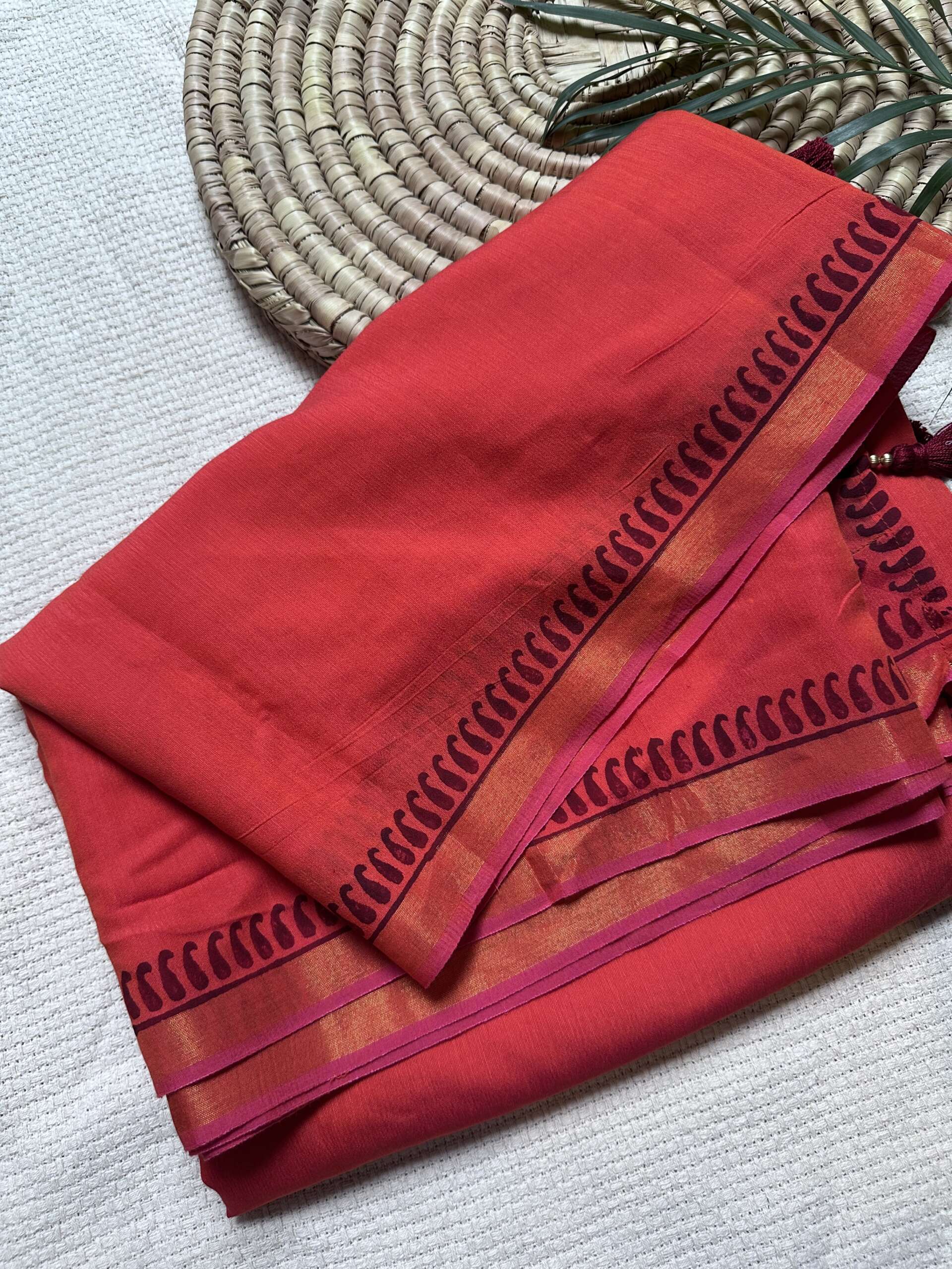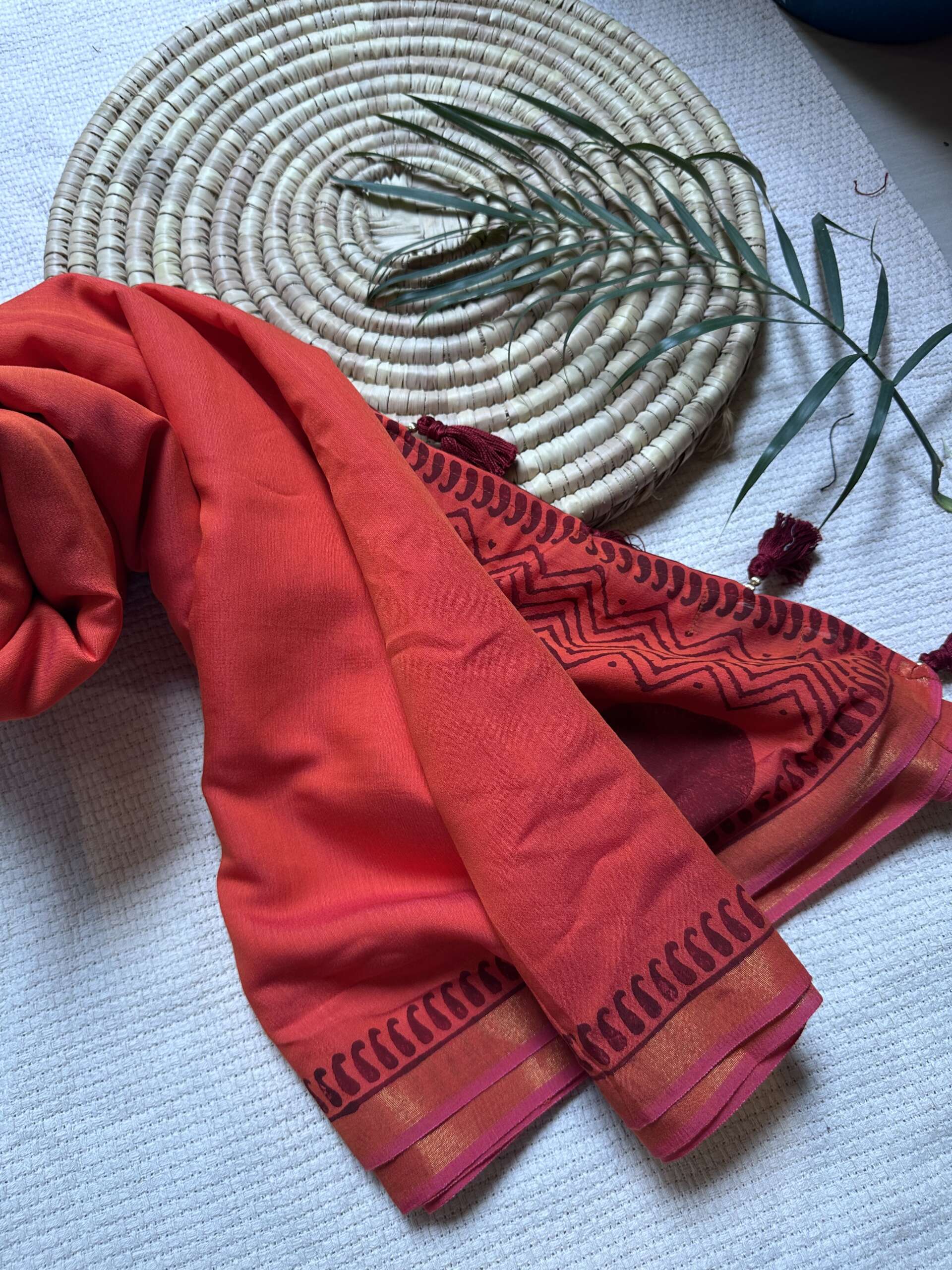 Material: Hand loom cottonsilk with hand block print and tassels detailing on pallu with orange blouse in cottonsilk