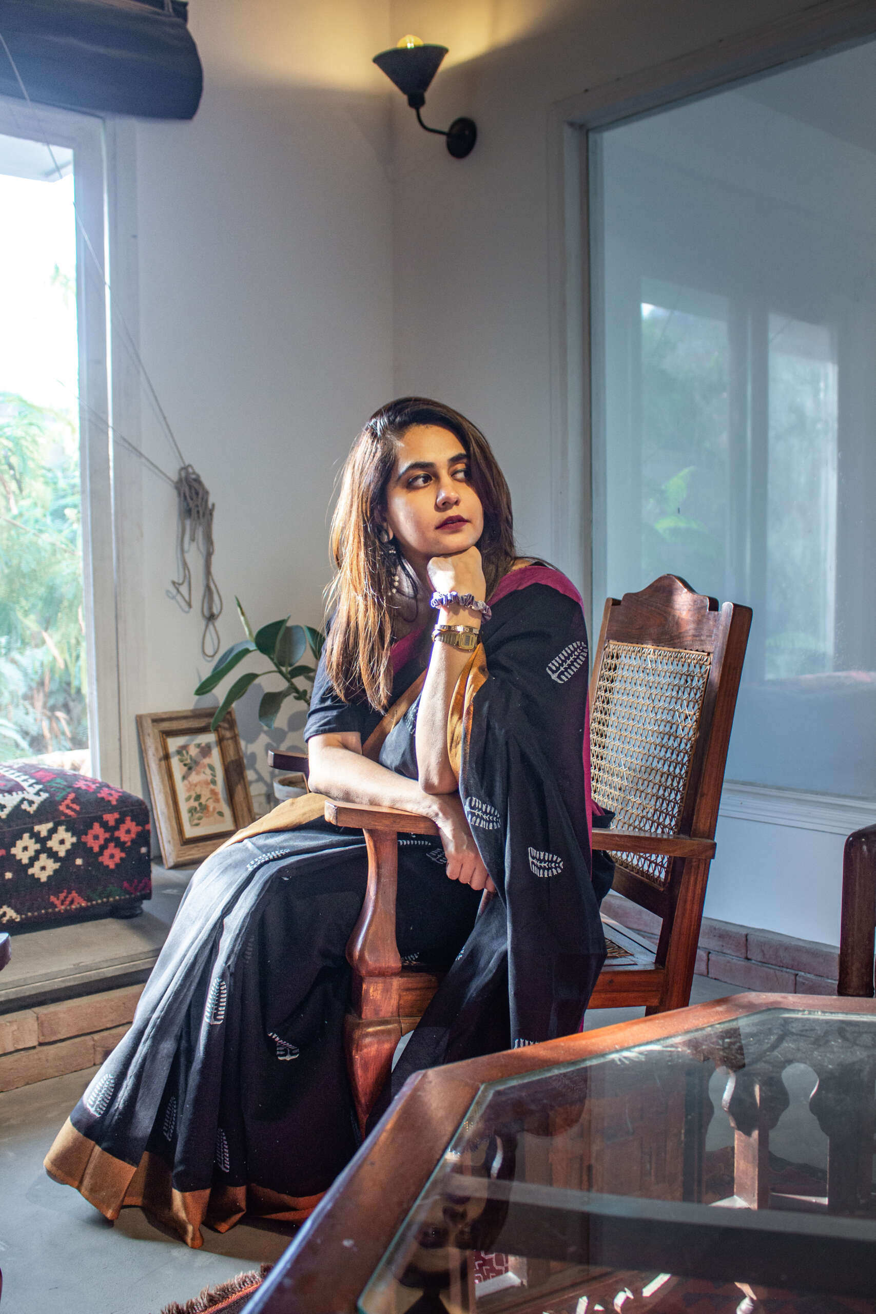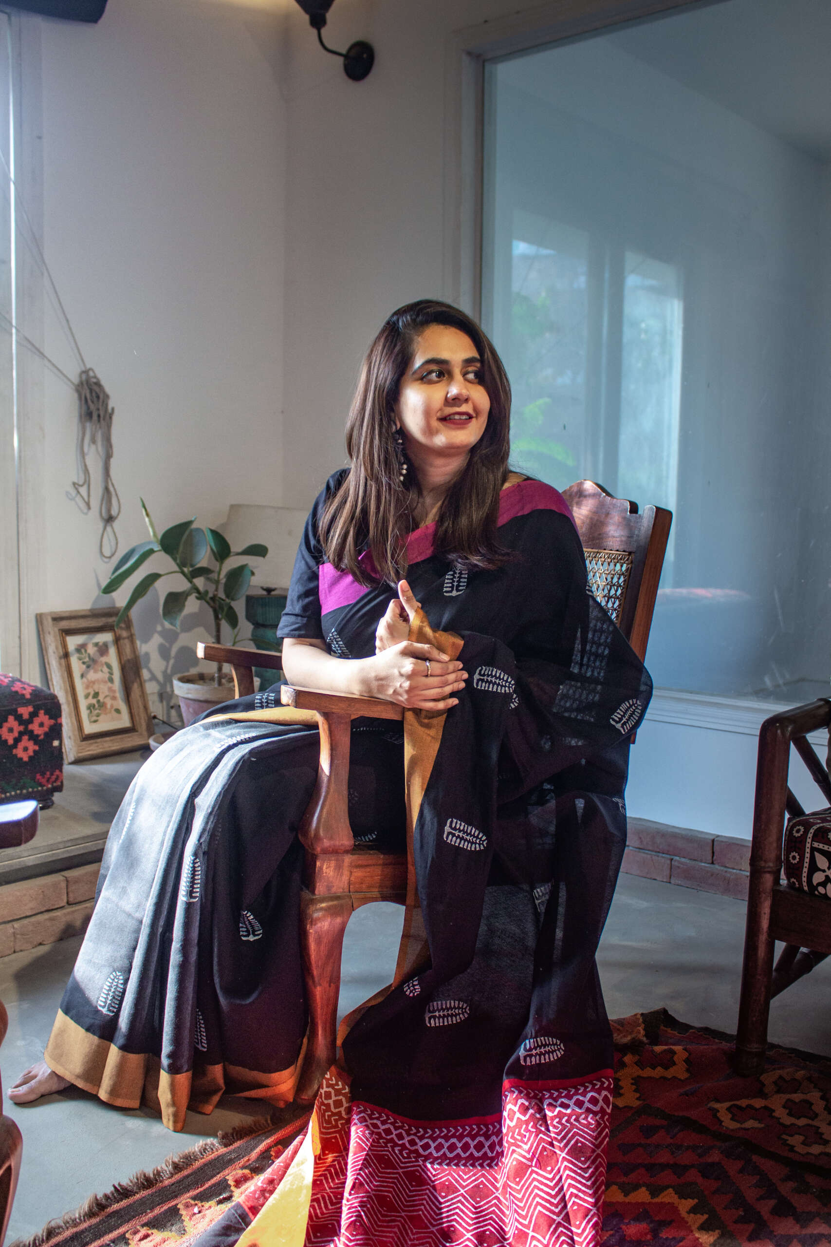 Material: Hand loom cottonsilk with hand block print and tassels detailing on pallu with black blouse in cottonsilk