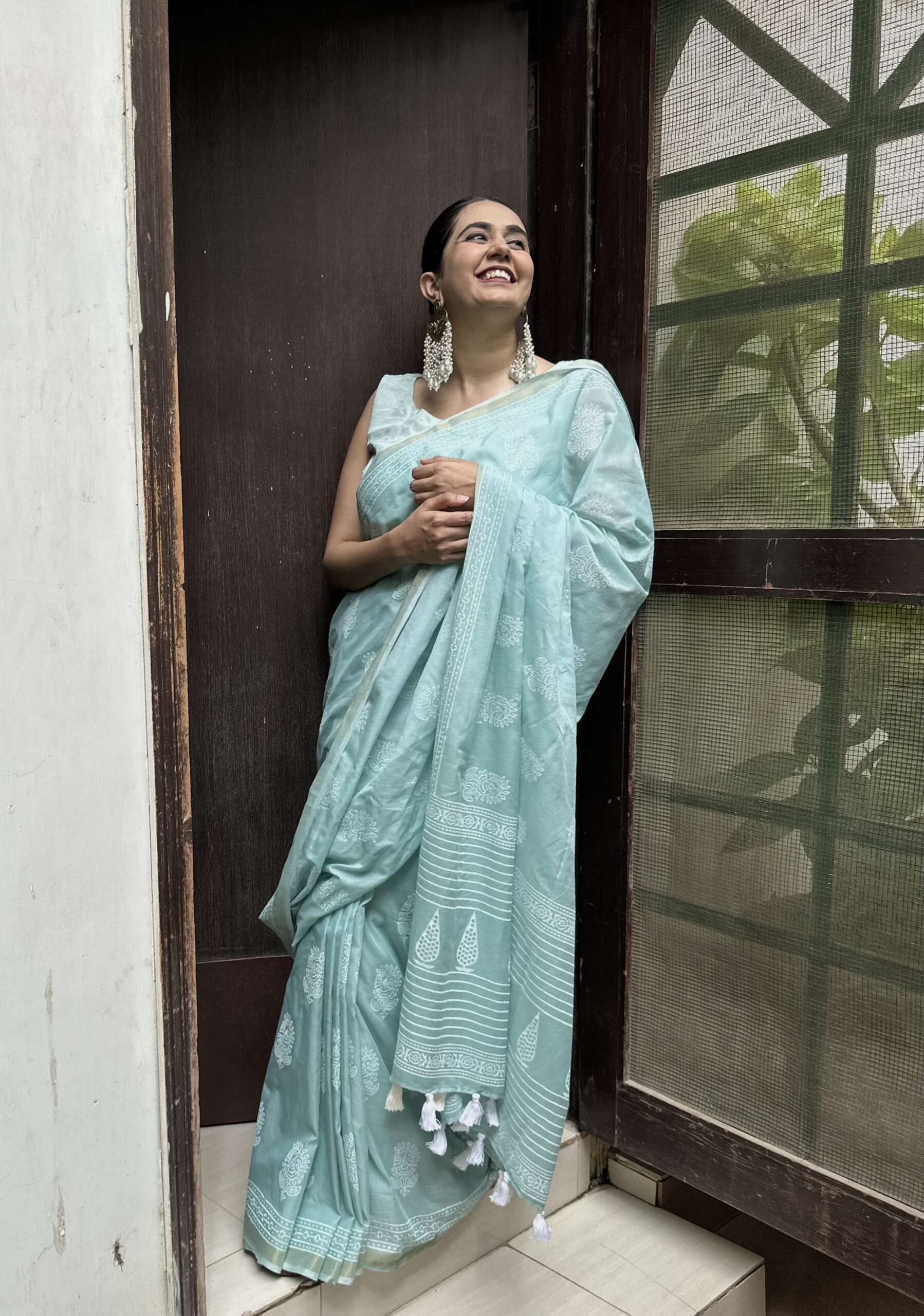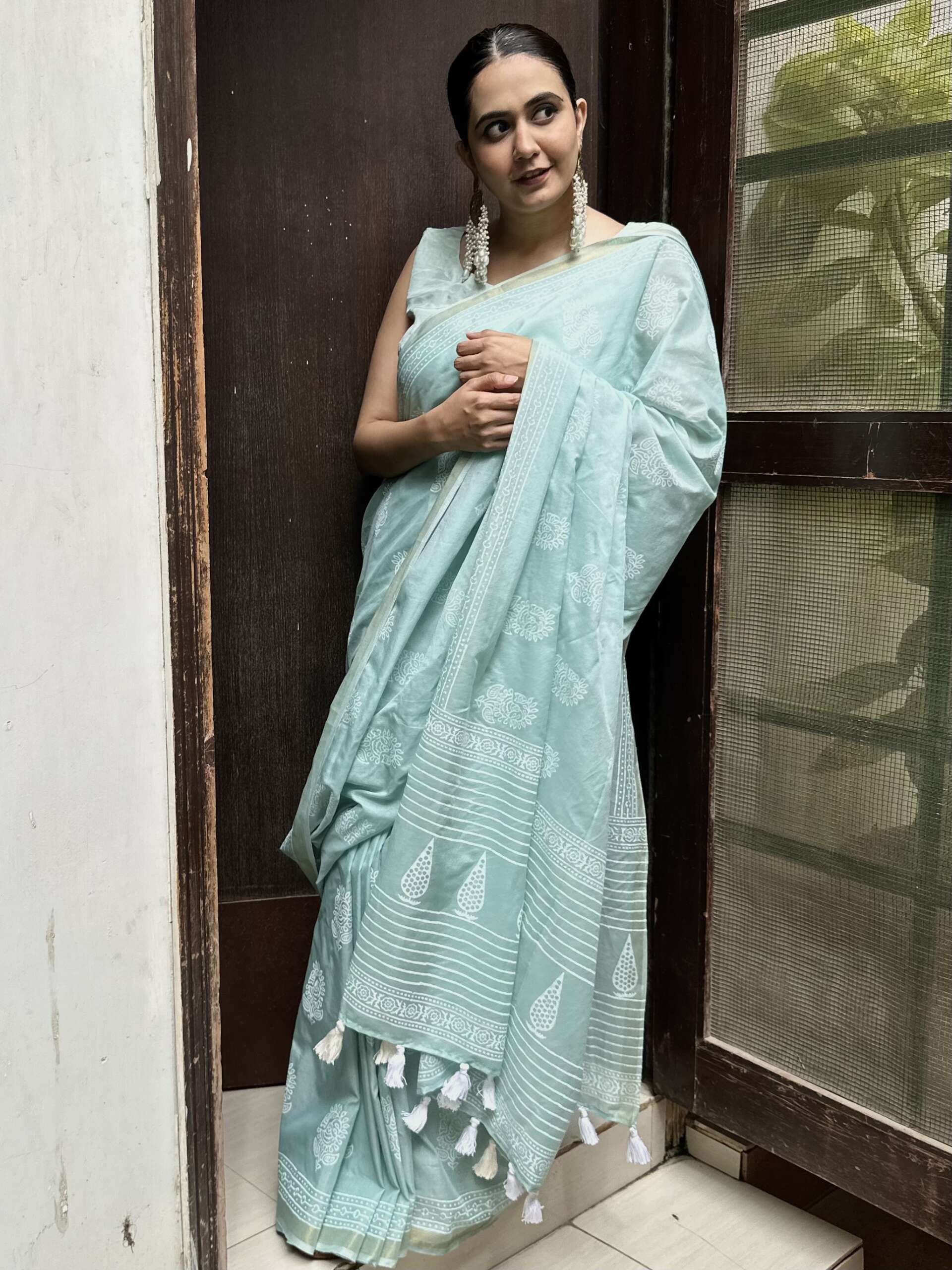 Material: cottonsilk hand loom saari with zari border and hand block print solid monochrome blouse