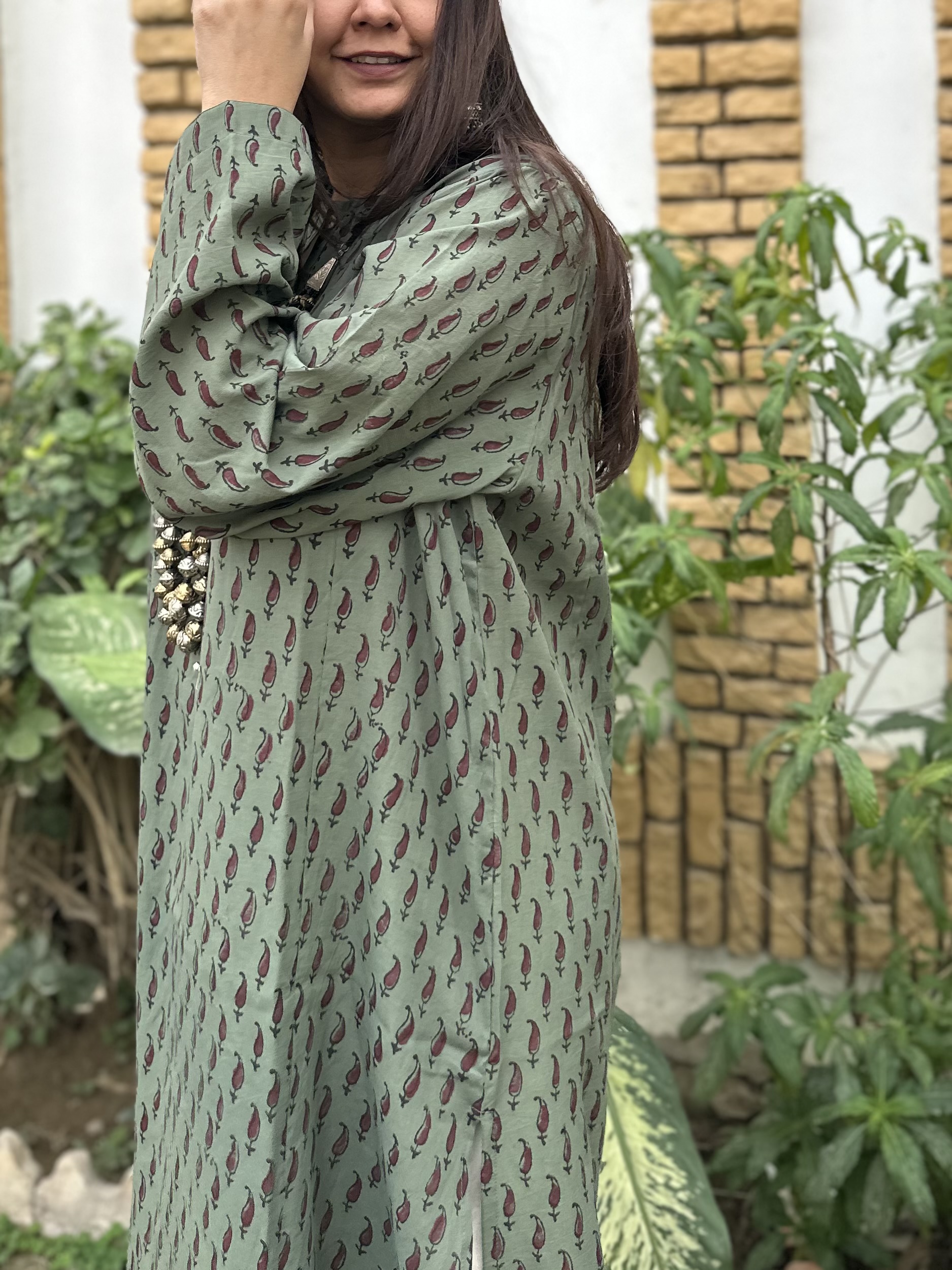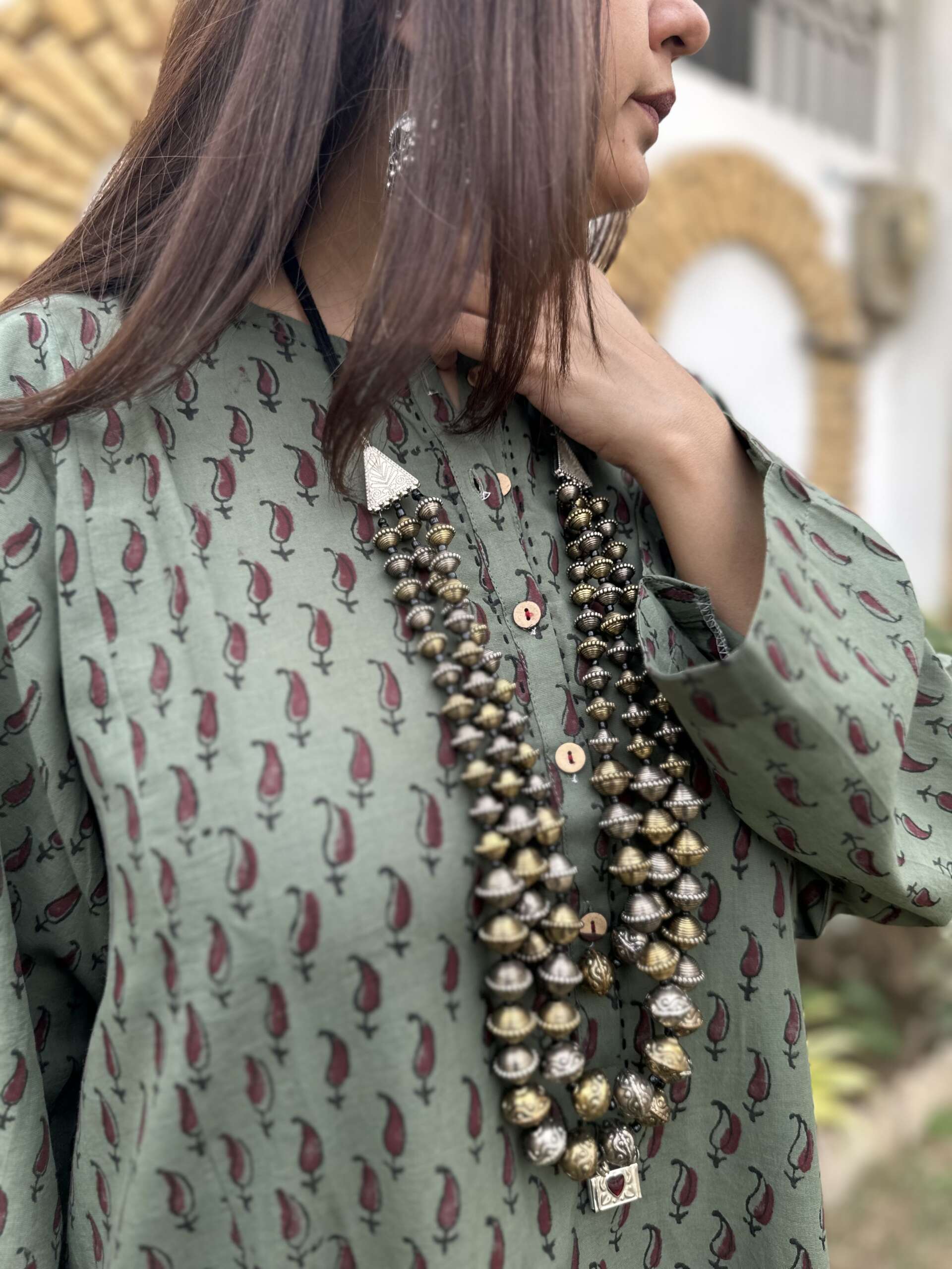 Kurta Material : Pure cotton fabric with hand block print in traditional motif details are done on the neck and edges of the shirt