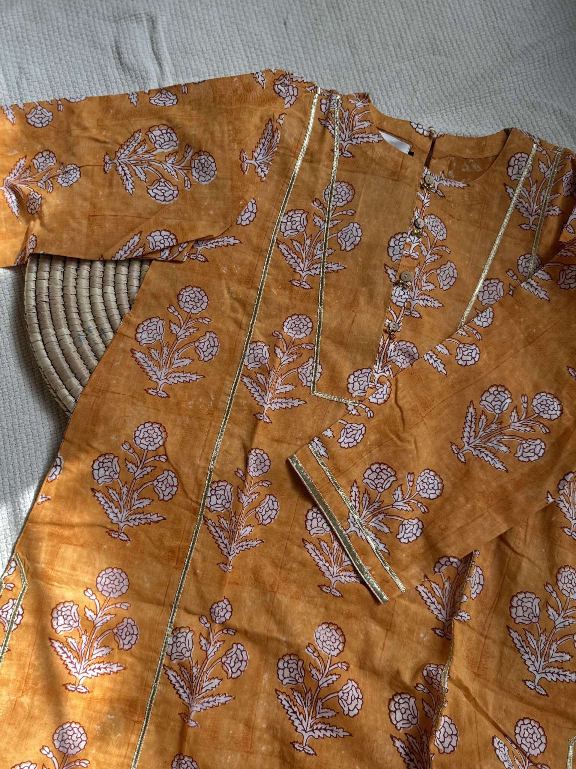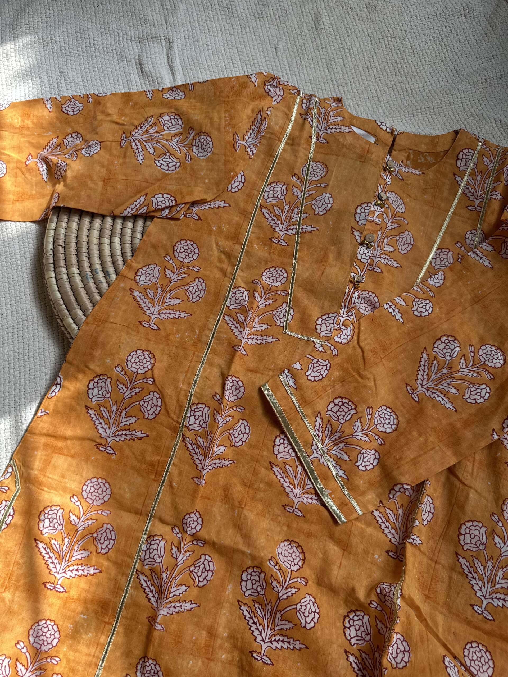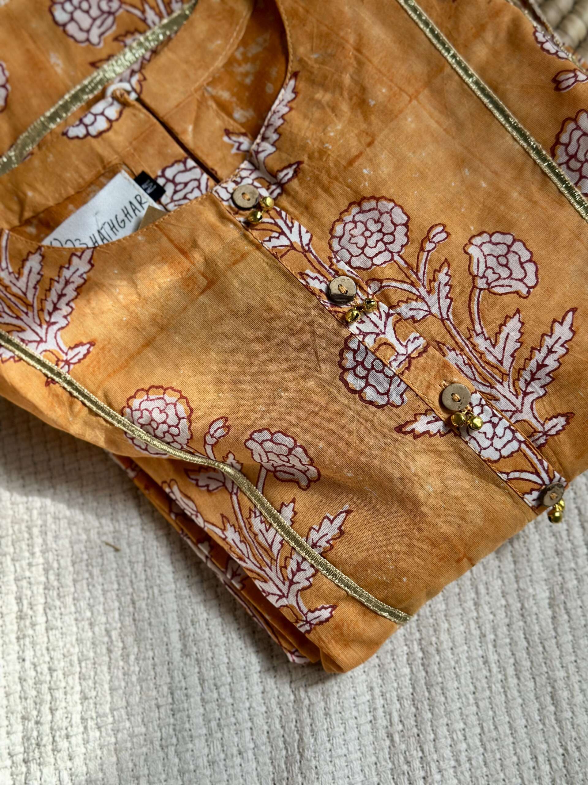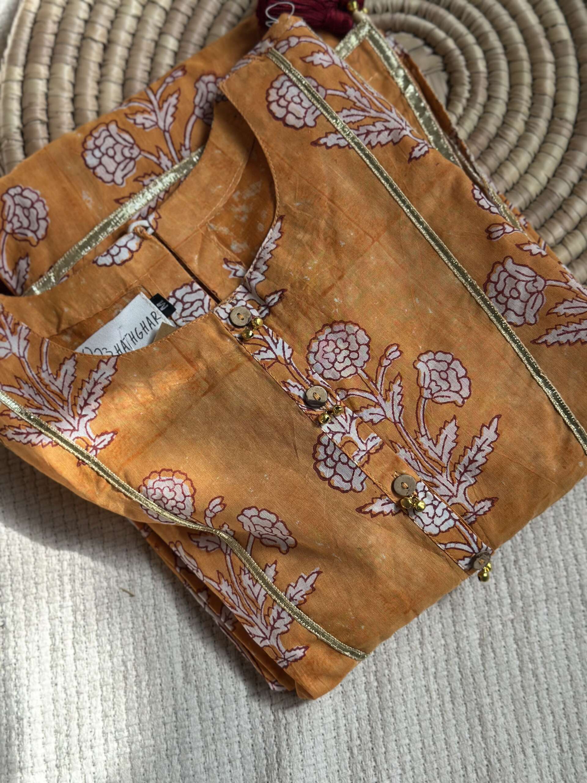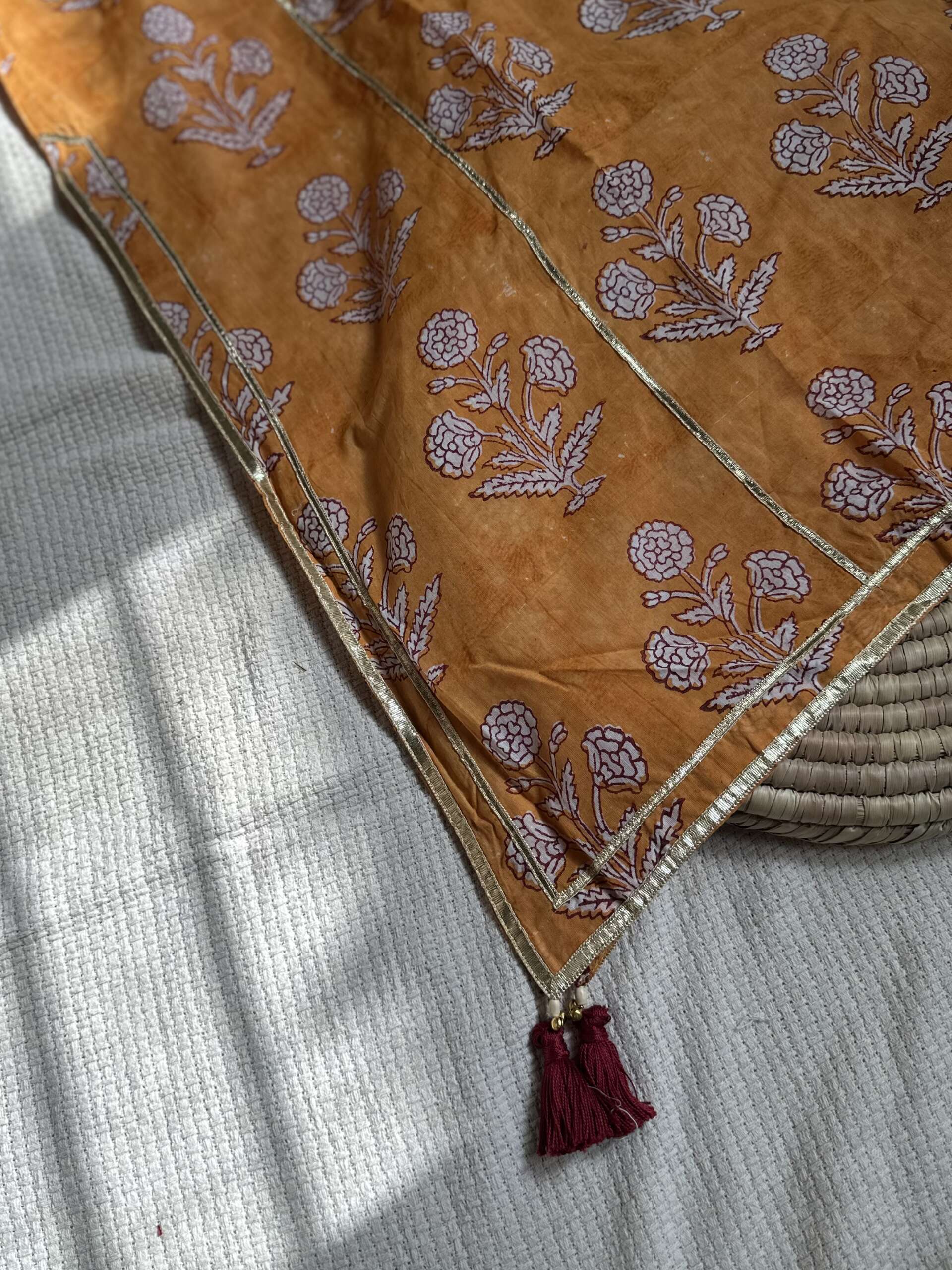 Material: Pure cotton hand block printed with gadh technique and adorned with gota work and details with shells and tassels