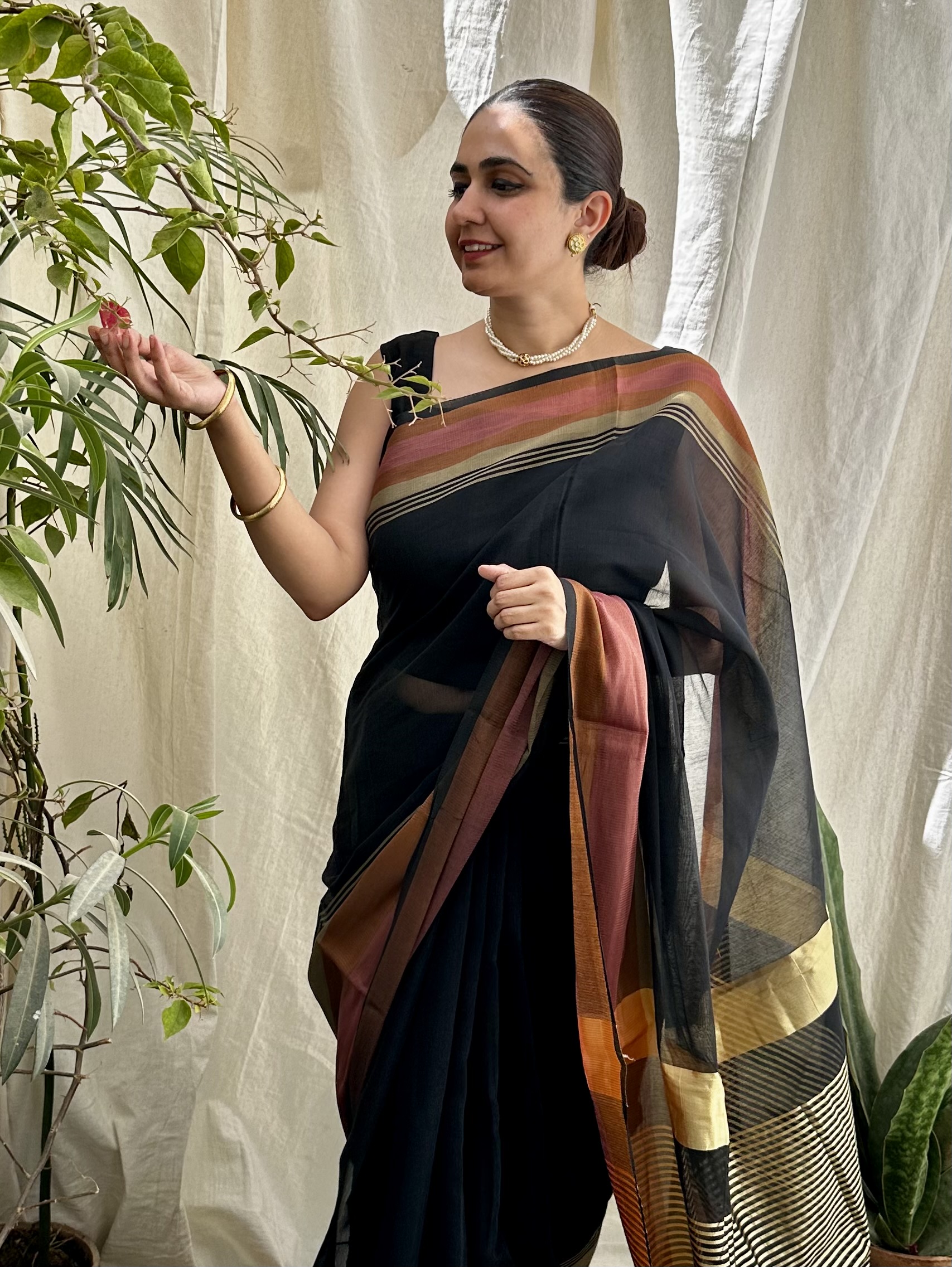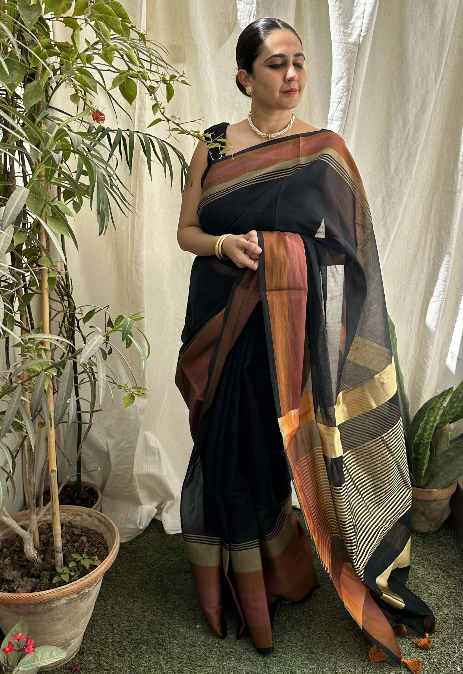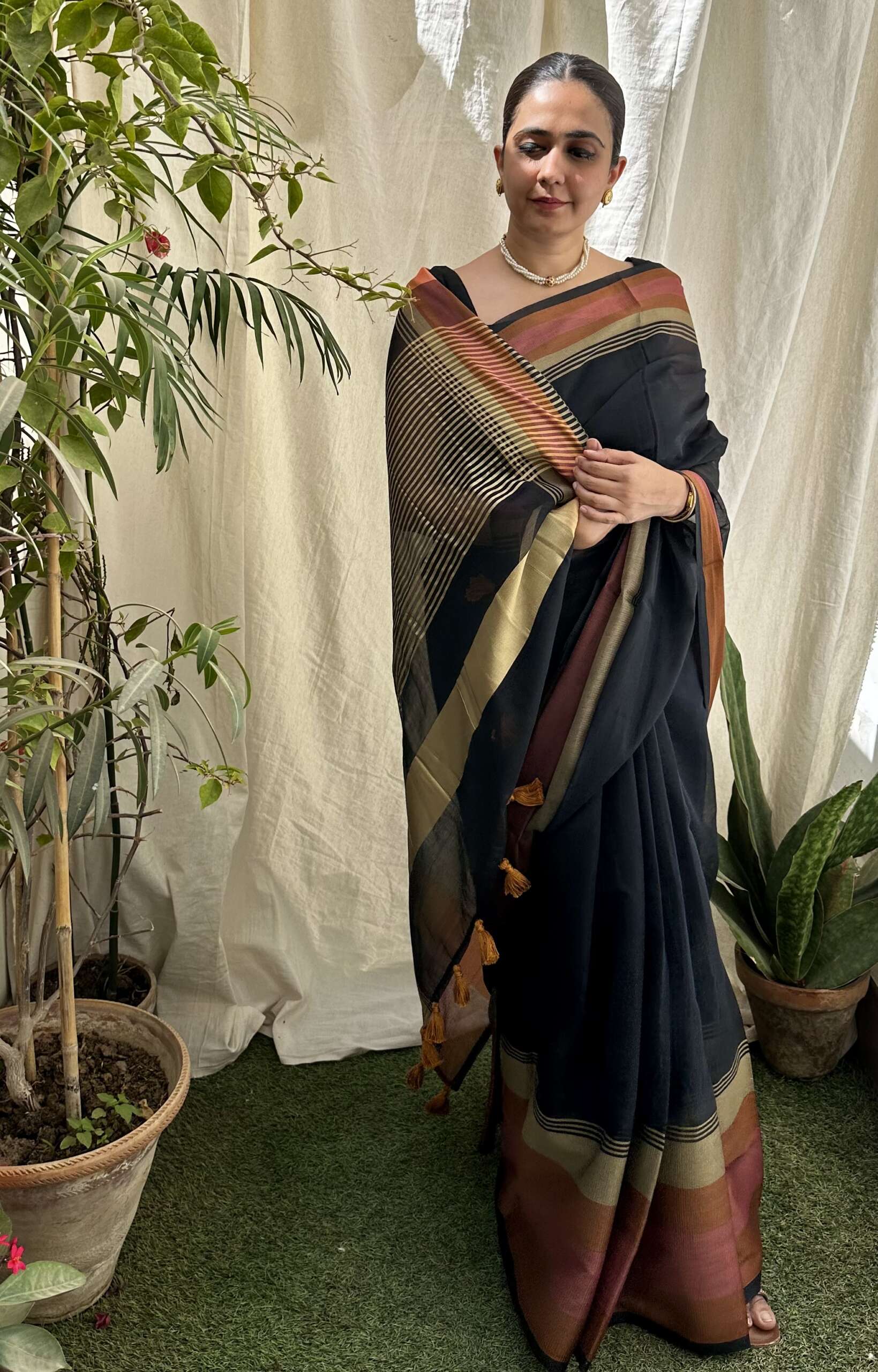 Material: hand loom cotton silk saari with zarri border and hand cratfed tassels with monochrome blouse