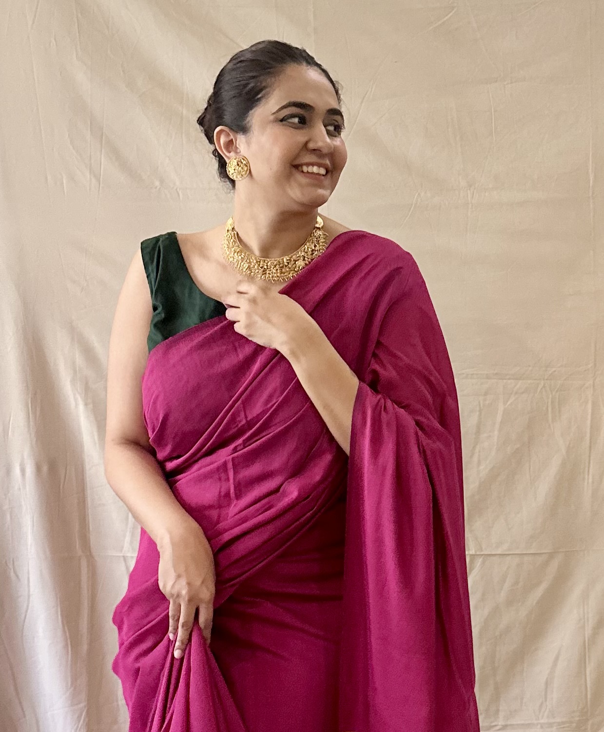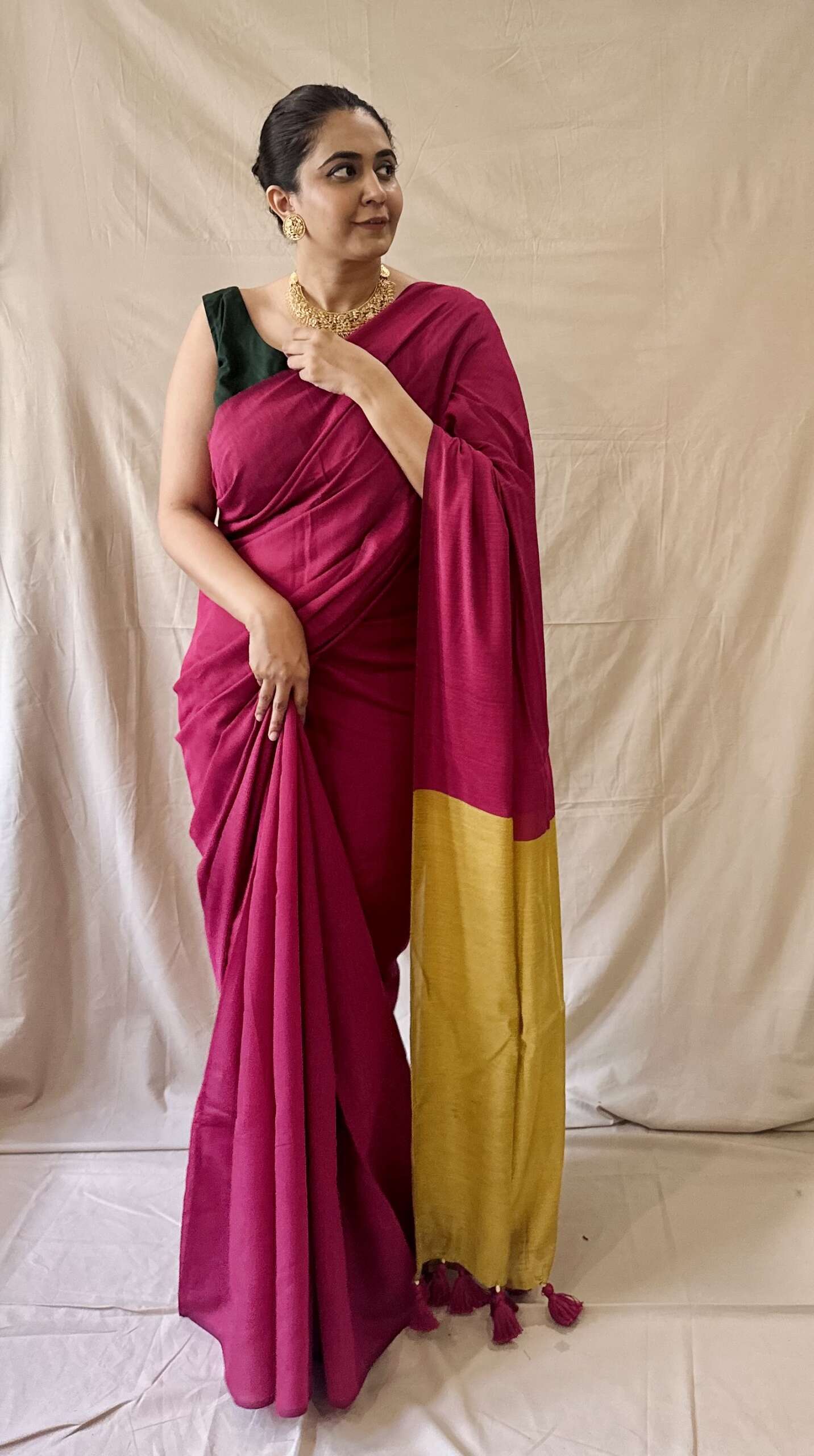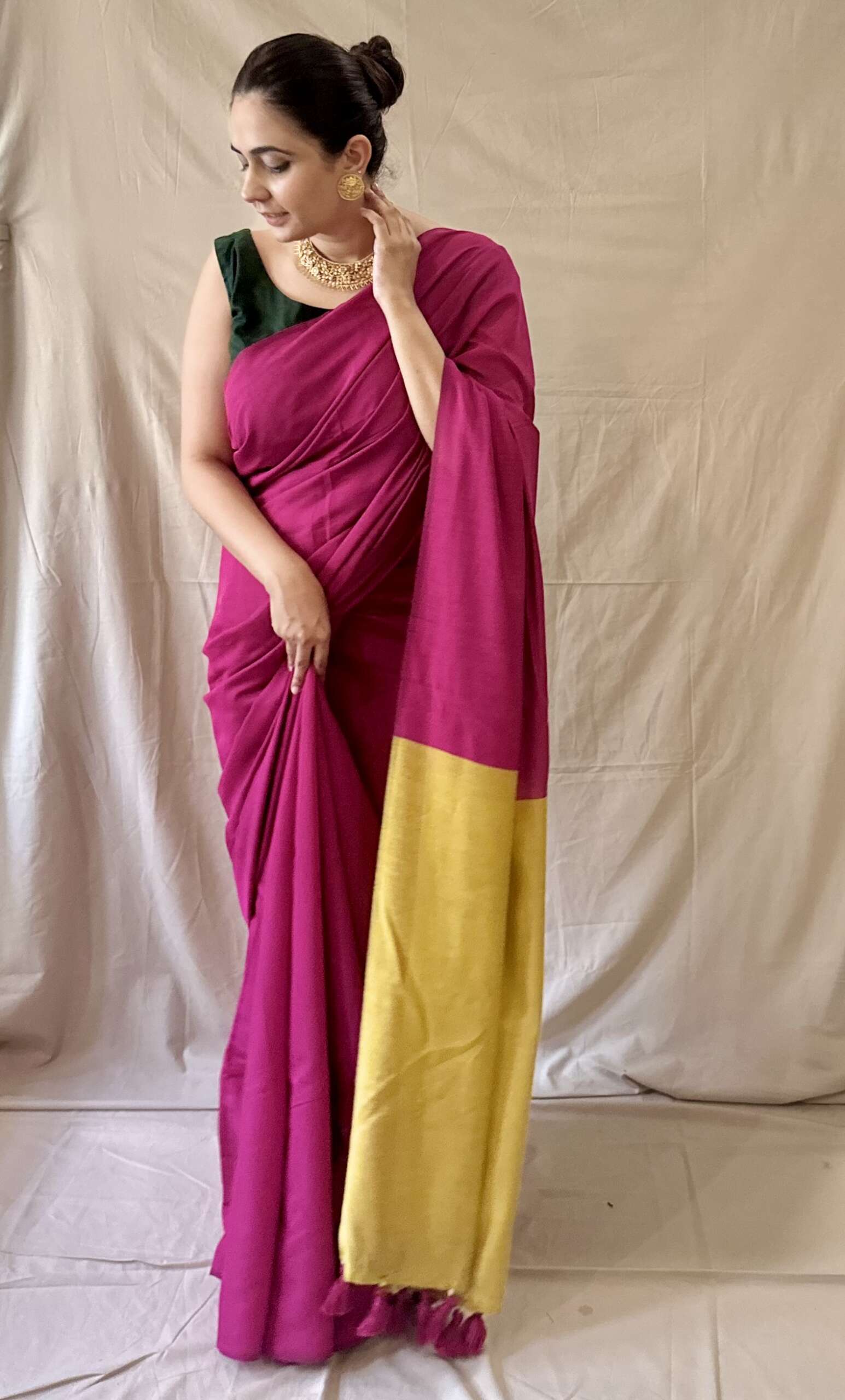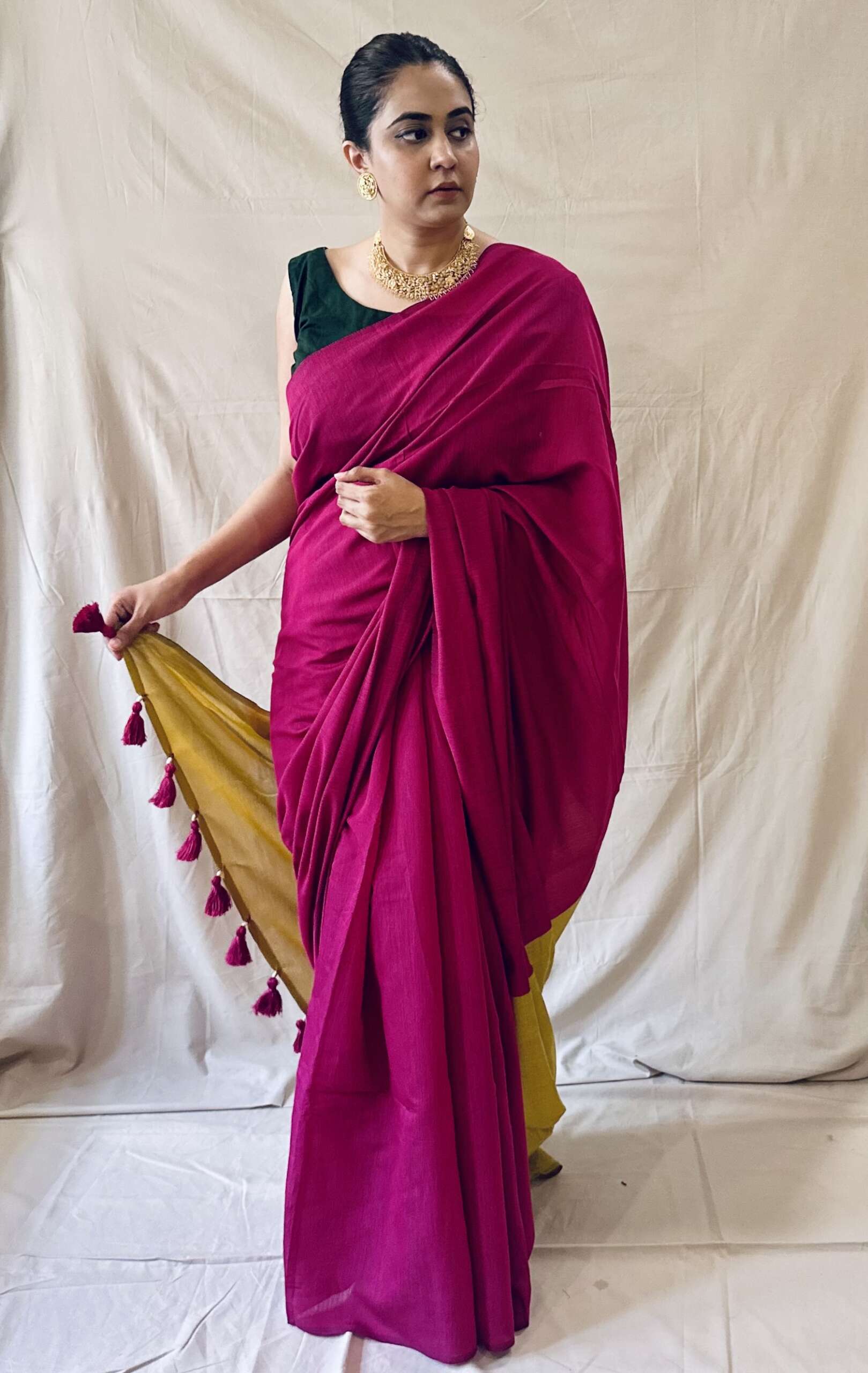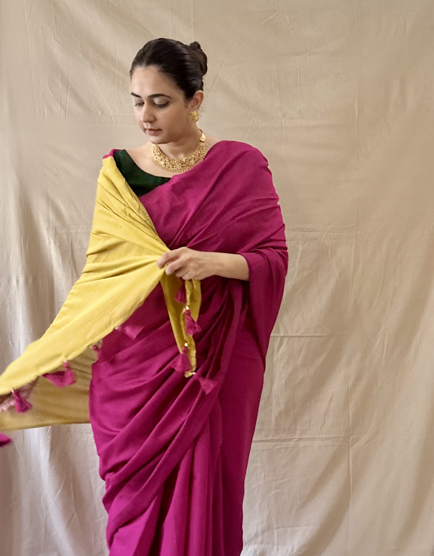 Material: Hand crafted cottonsilk saari with tassels detailing on pallu and matching blouse in magenta