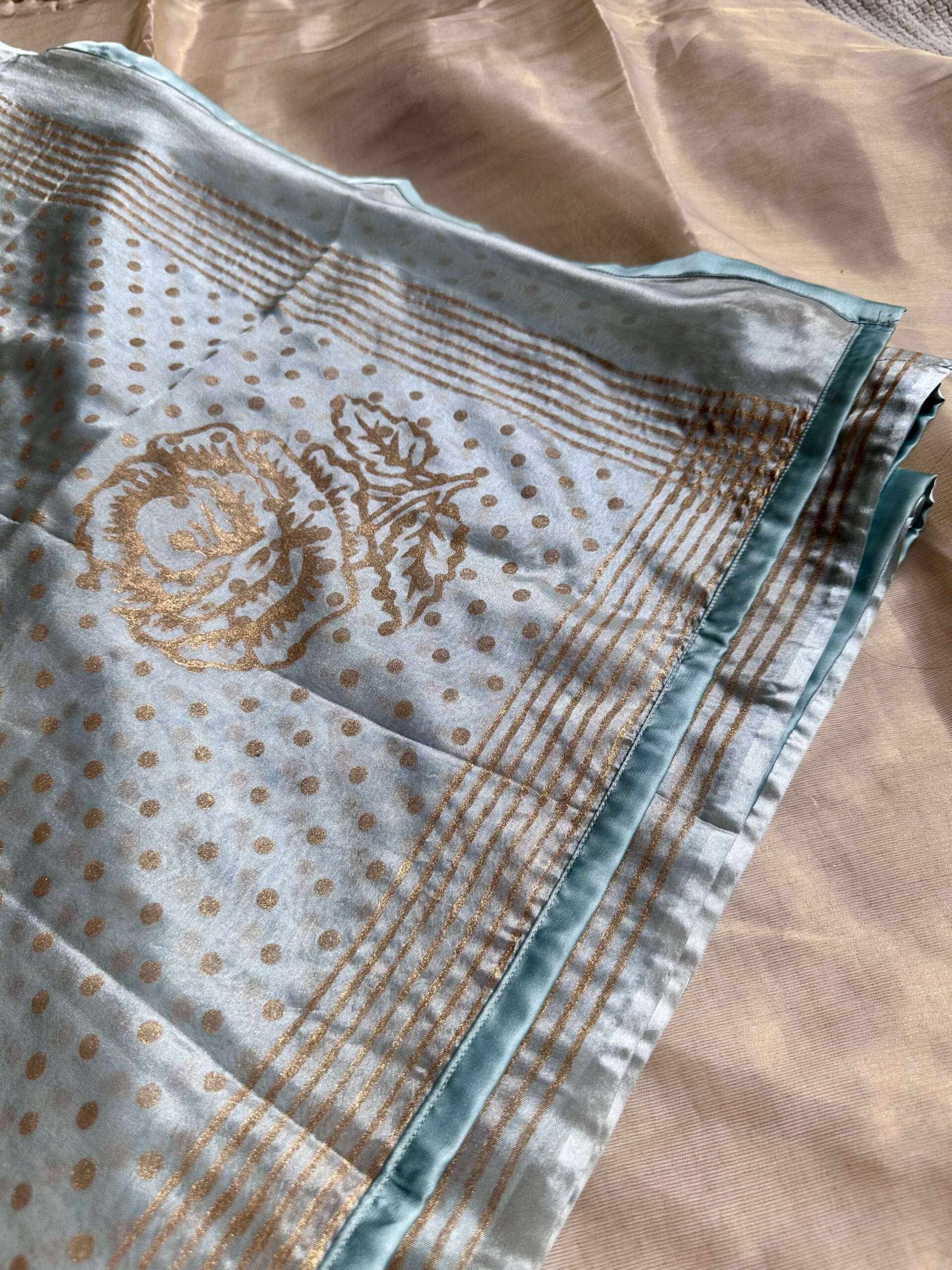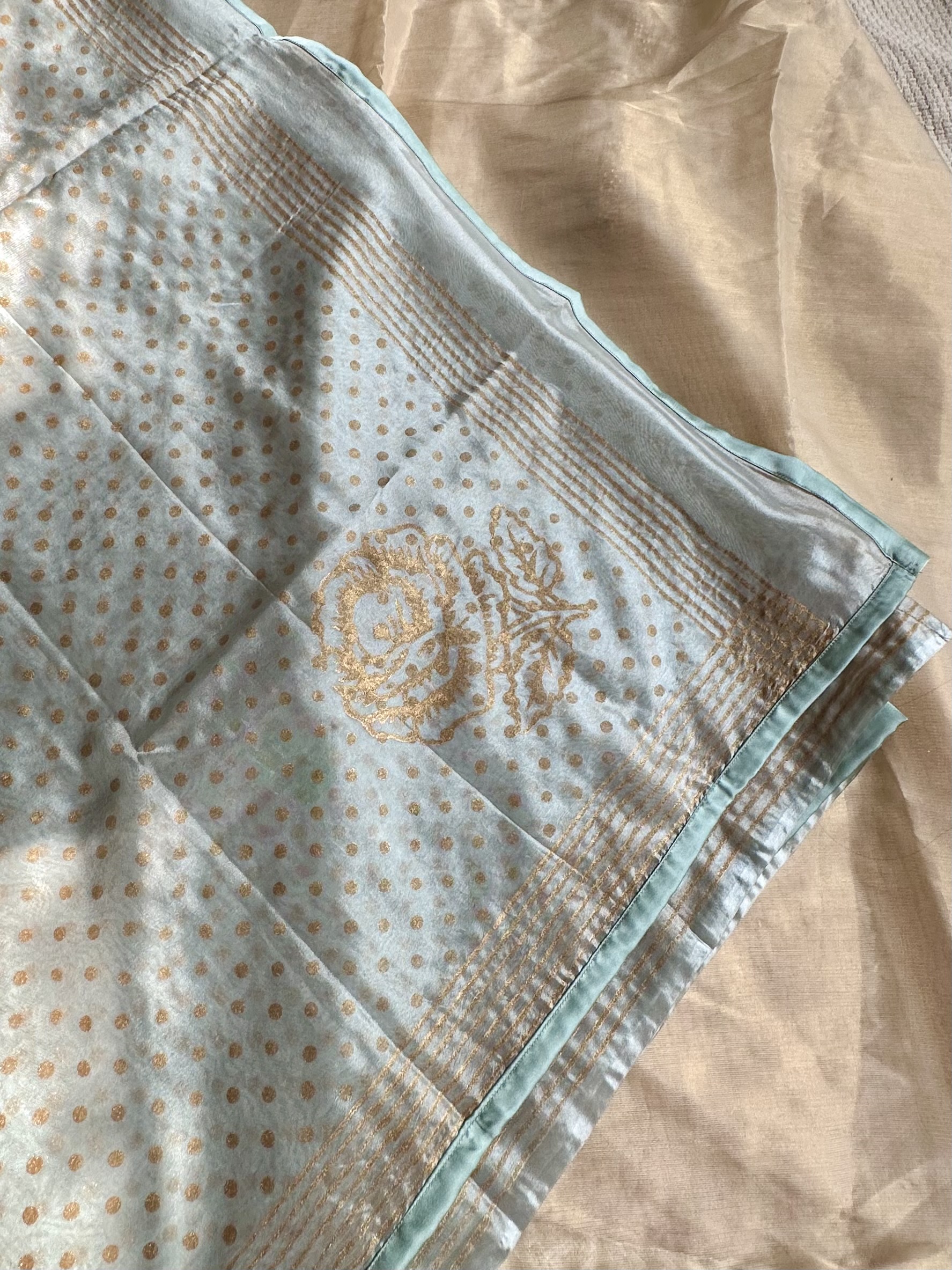 material : Organza silk hand block printed saari with cotton silk monochrome blouse